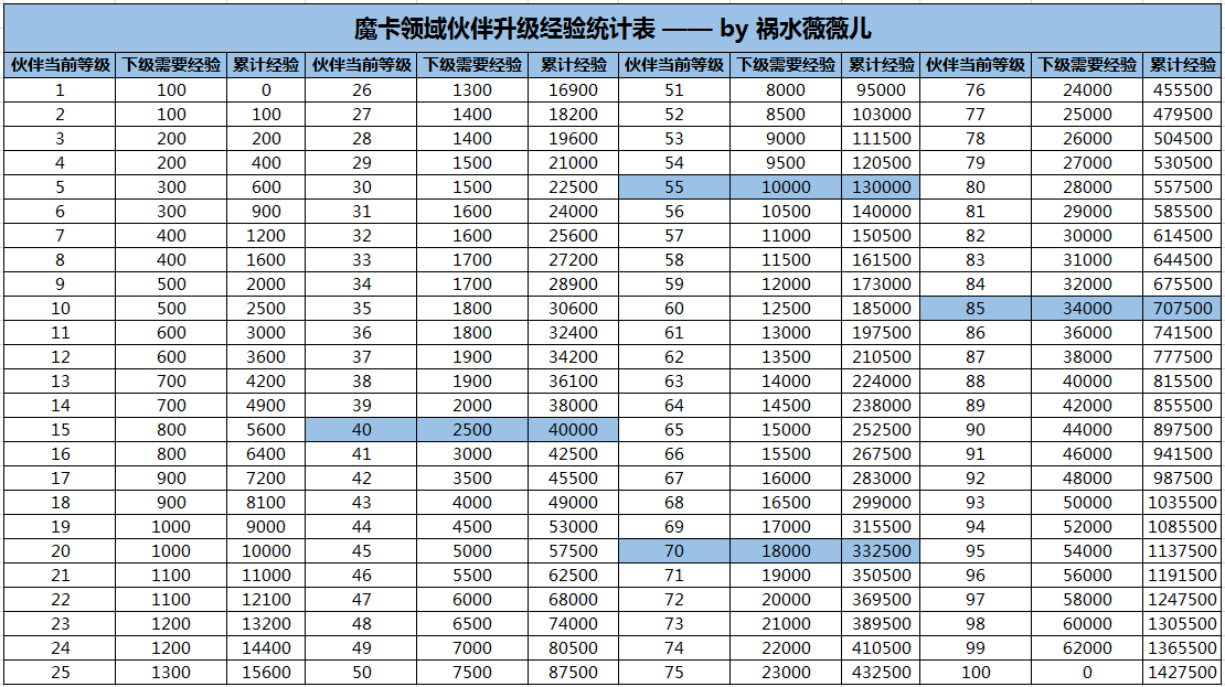 上图是来自于薇薇儿大佬帖子里关于伙伴升级经验需求量的数据,可以看到升级一个100级的伙伴的资源够升级4个70级的。