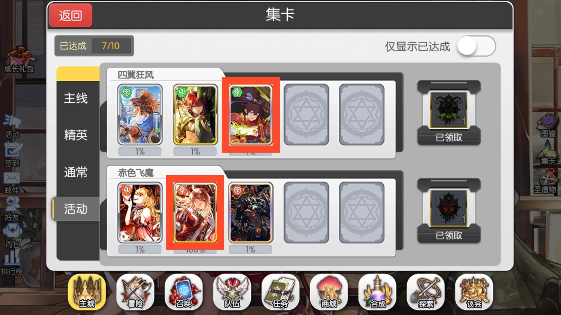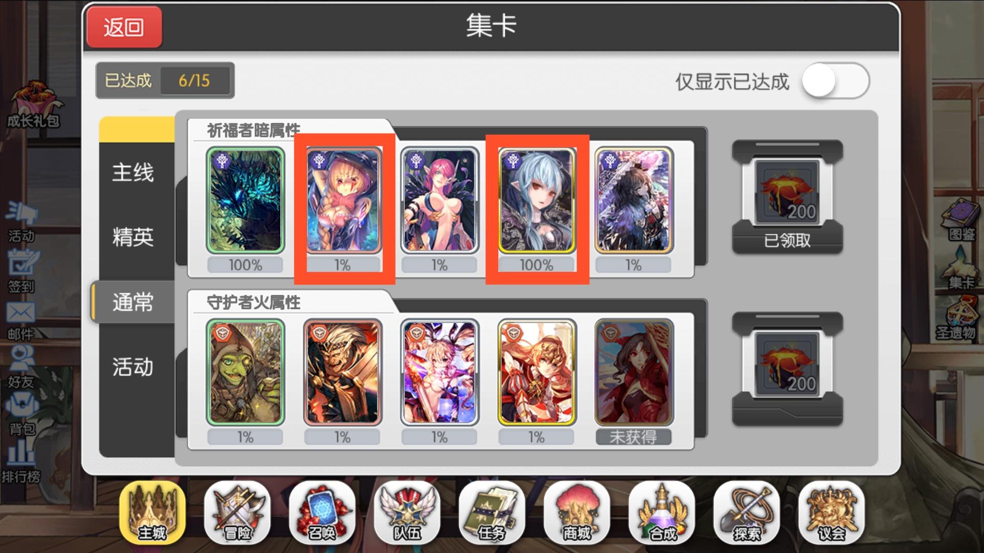 接下来我们需要做的就是刷出委托任务第一话A到D四个区大师难度的魔卡,然后到集卡的精英页面领取第一话的公会圣物。无论你练的是火队还是水队,都优先刷出第一话的公会圣物。