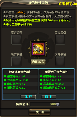 铜铸重置齿轮适用于70级以下(不含70级)装备的绿色属性重置;