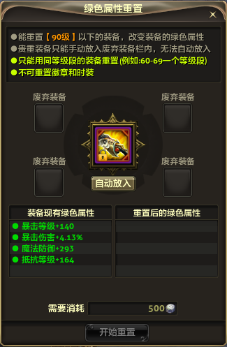 放入4件废弃粉色装备时,出现极品属性的概率为很高。 不推荐全部放入4件紫装及以上装备进行重置,太奢侈并且回报不稳定,建议放入1件绿品质或蓝品质的同等级段装备即可。 3、挑选装备放入后,点击开始重置。(齿轮为消耗道具,每次使用后将消失)
