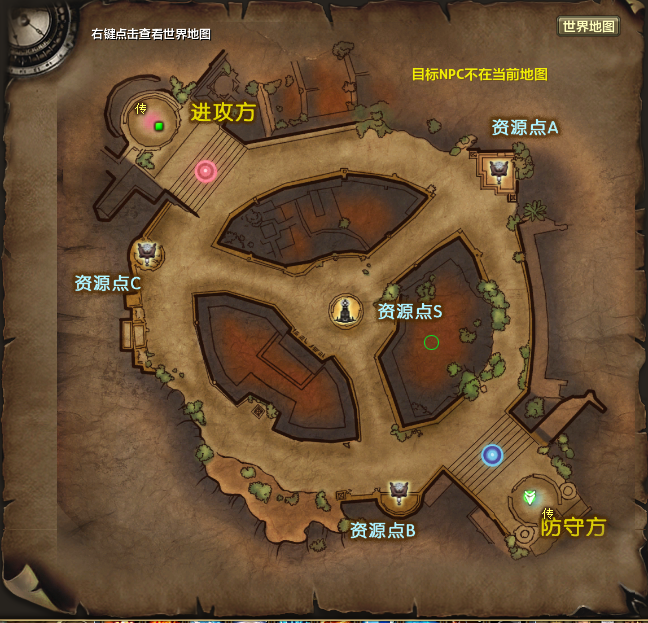 两方各自从复活点出发,争夺地图内的资源点A、B、C、S,占领资源点后,每秒将可获得一定的资源点,率先达到20000资源数量的公会将可获得据点占领权。