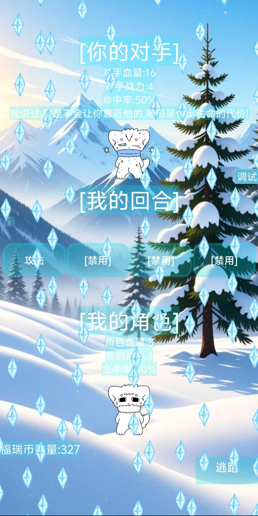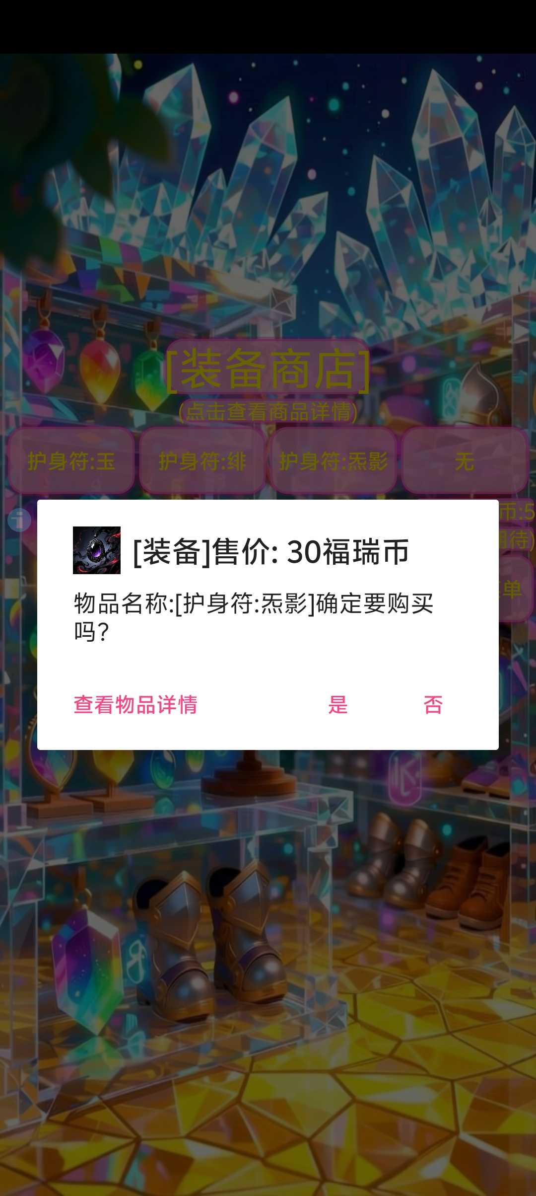 [游戏介绍]:这是一款回合制角色扮演赌命游戏,一个靠运气、血量、装备、战力战胜对手赢得奖励的回合制游戏,玩家不仅需要在战斗中靠运气躲避对手的攻击,也要靠丰富的战斗资质战胜对手赢得奖励...... [更新内容] 版本9.666更新内容介绍 修复已知战斗系统和对话框不显示等bug,由于福瑞商店商家内斗闹矛盾,现已将福瑞商店分为武器商店与装备商店,新的装备[护身符]:炁影,装备时永久增加额外三格血,获取方式:在装备商店里购买即可...