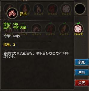 5、最后一个主动天赋技能,我一直在徘徊纠结中,因为我属于一名平民玩家,复仇女神这个天赋对于我来说比较奢侈,所以我选择了黑暗阵营:地狱魔神的邪术: 吸取目标攻击力25%,持续 10秒,自身提升目标攻击的25%,持续10秒,这个主动天赋,对于普通玩家来说相当实用,削弱对方攻击,提升自己攻击,可以说是以弱胜强的BUG技能,而且能量消耗才3,相当实用,可以在你实用了能量爆破后,继续使用这个天赋