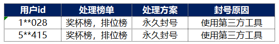 除此之外,我们还监控到,部分练习生在使用了第三方工具,严重影响了现网的竞技平衡,对于确定使用了第三方违规工具的玩家,我们已经对其账号处以“永久封禁”的处罚。封号名单公示如下: