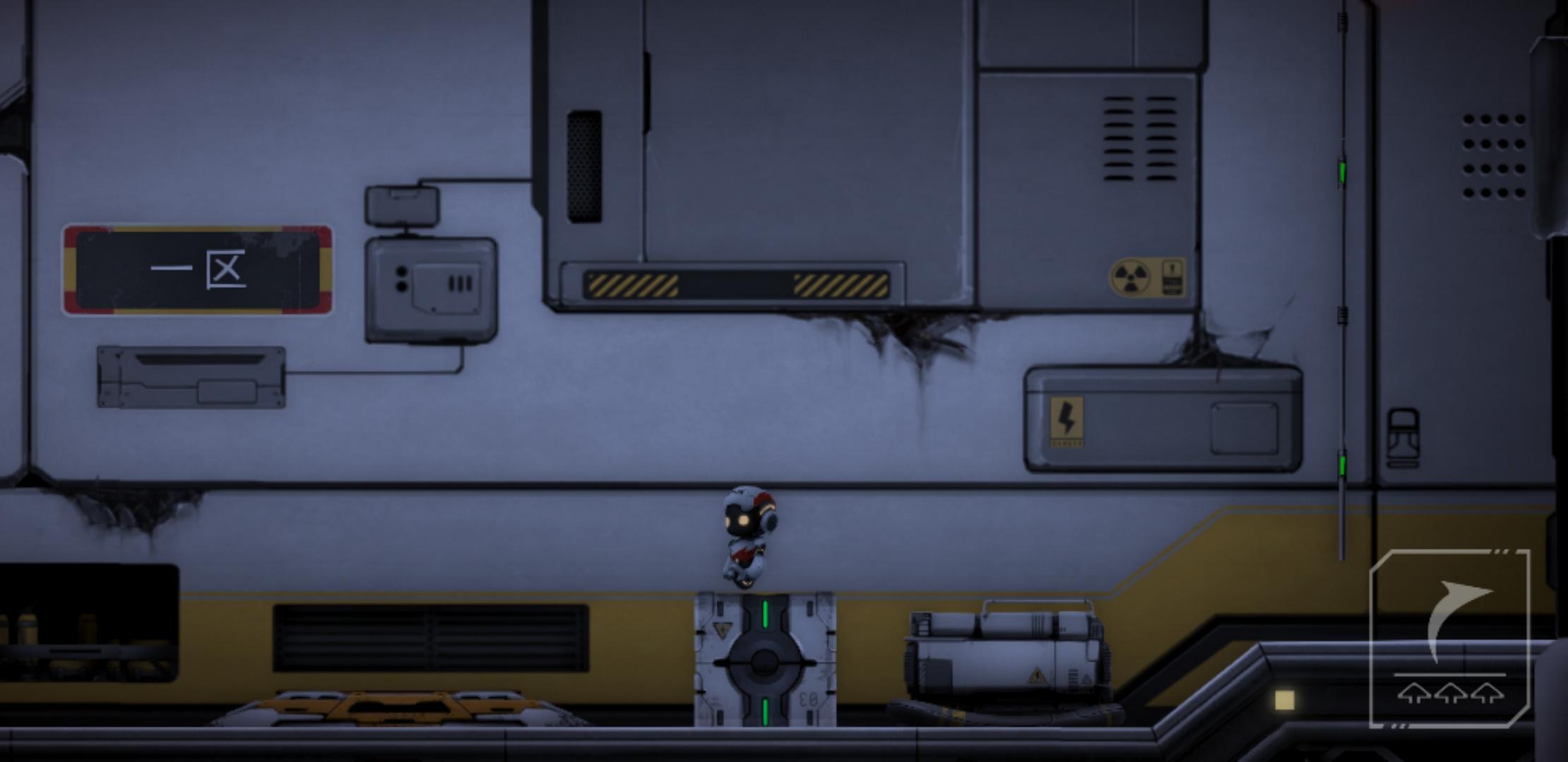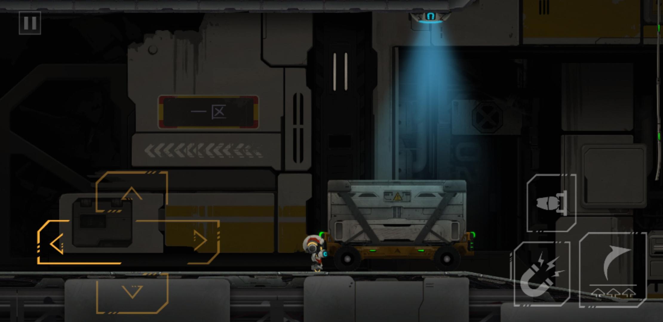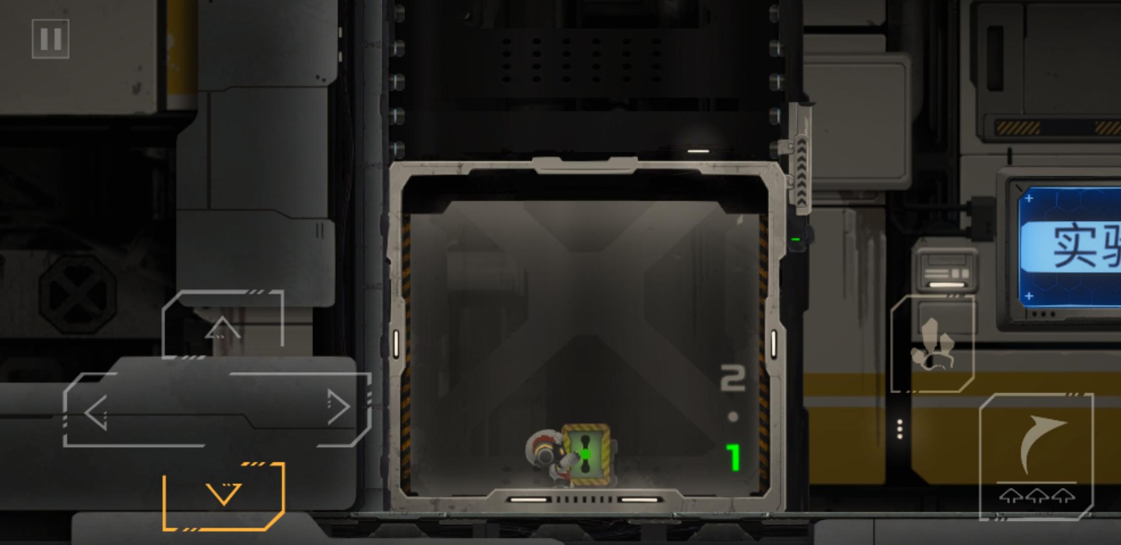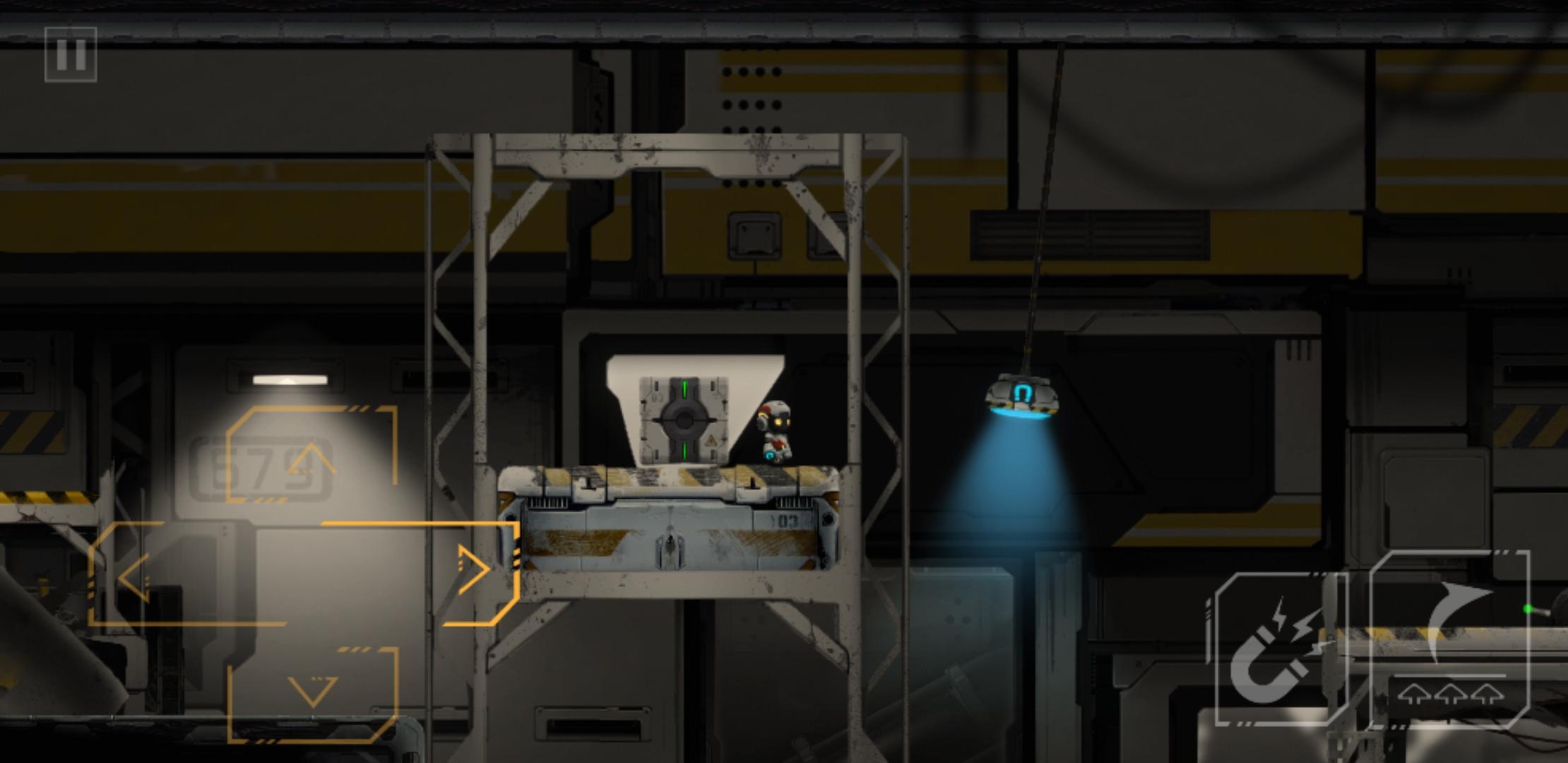 推下箱子后,原路返回,把电路拉上去,开启右边的磁吸盘,来到靠近磁吸盘的缺口,通过升降台,跳到箱子的左边,把箱子和升降台推到如下图所示位置,和箱子一起上升降台(此时角色依旧在箱子左边),角色通过升降台到左边有电路开关的平台上,再跳到箱子上,和箱子一起升上平台,吸住右边的磁吸盘,到达右边平台