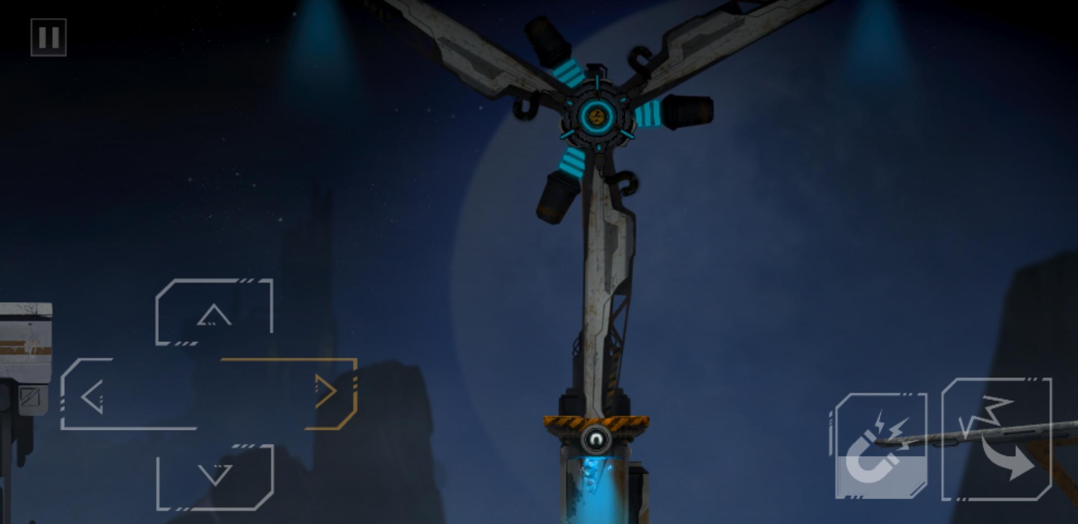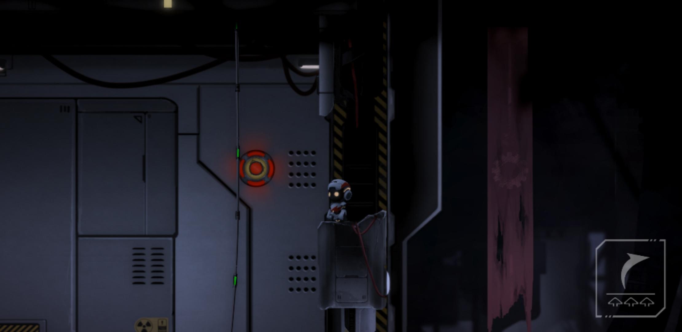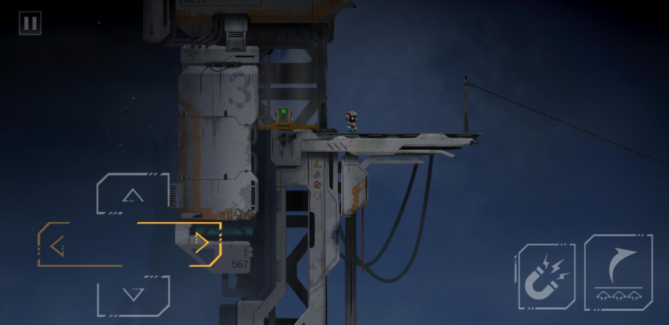 推下箱子后,原路返回,把电路拉上去,开启右边的磁吸盘,来到靠近磁吸盘的缺口,通过升降台,跳到箱子的左边,把箱子和升降台推到如下图所示位置,和箱子一起上升降台(此时角色依旧在箱子左边),角色通过升降台到左边有电路开关的平台上,再跳到箱子上,和箱子一起升上平台,吸住右边的磁吸盘,到达右边平台