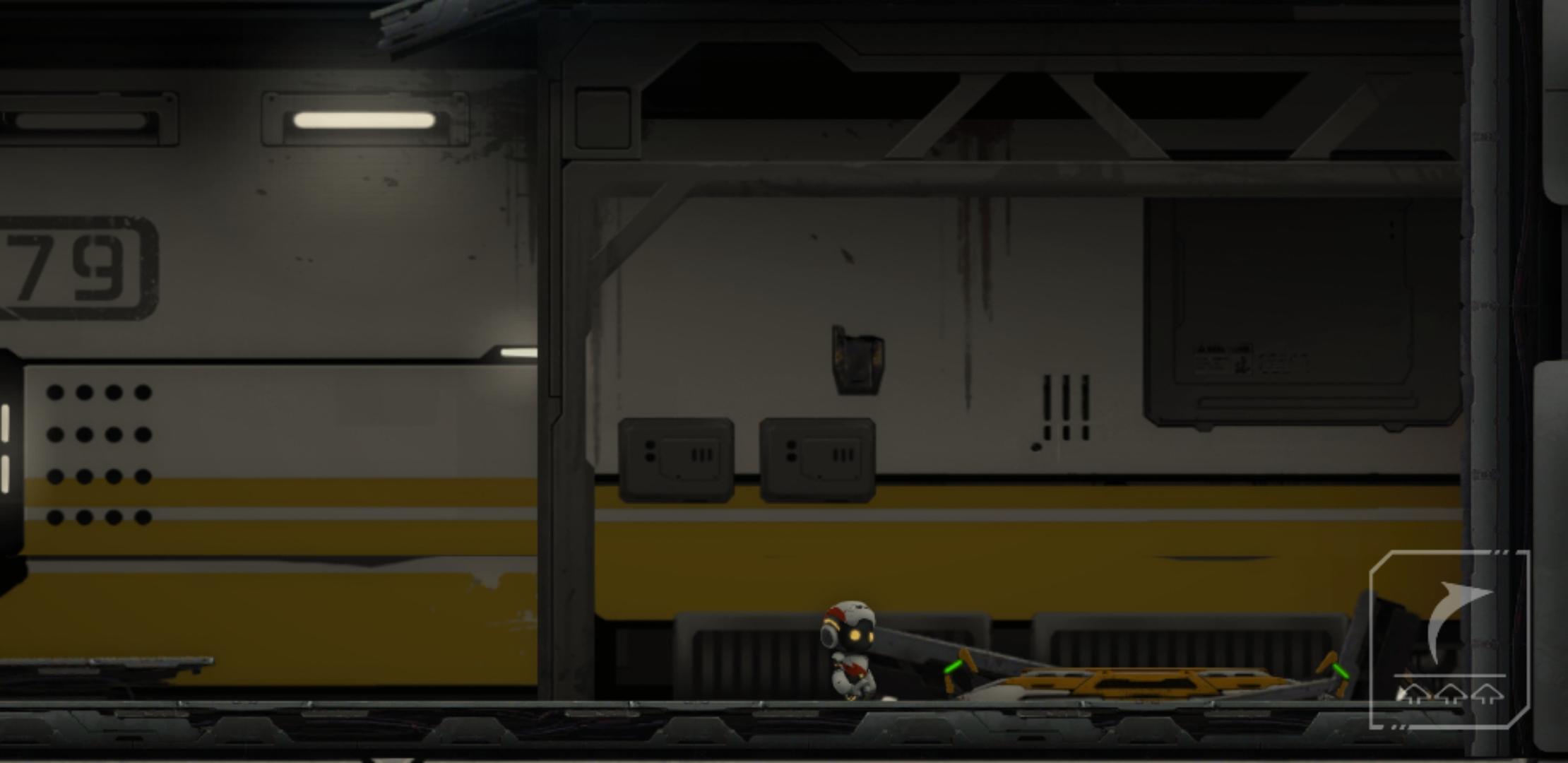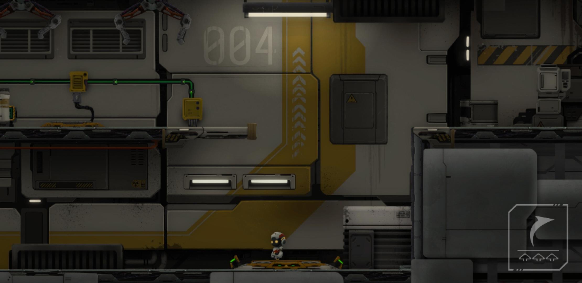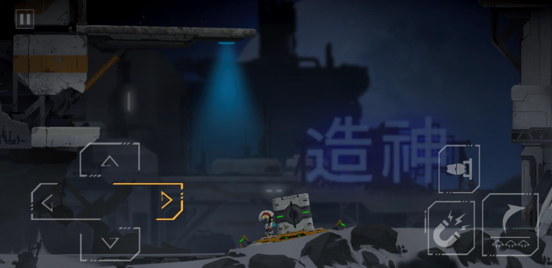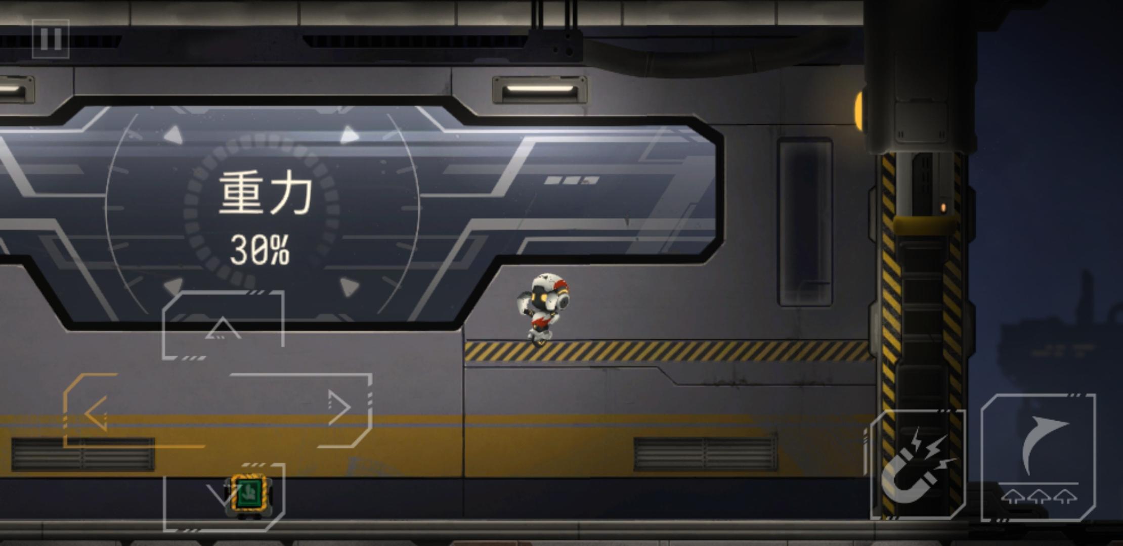 推下箱子后,原路返回,把电路拉上去,开启右边的磁吸盘,来到靠近磁吸盘的缺口,通过升降台,跳到箱子的左边,把箱子和升降台推到如下图所示位置,和箱子一起上升降台(此时角色依旧在箱子左边),角色通过升降台到左边有电路开关的平台上,再跳到箱子上,和箱子一起升上平台,吸住右边的磁吸盘,到达右边平台