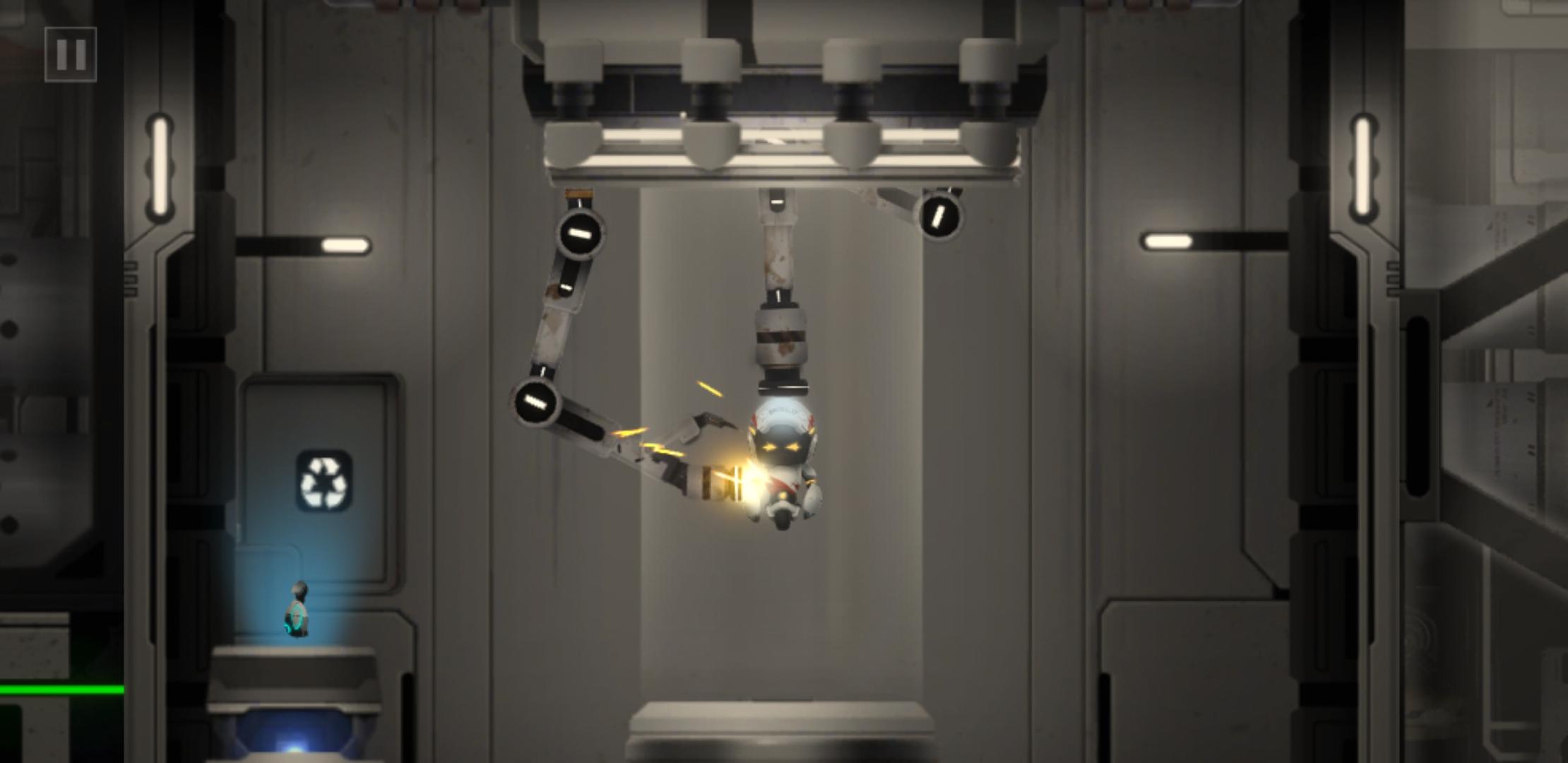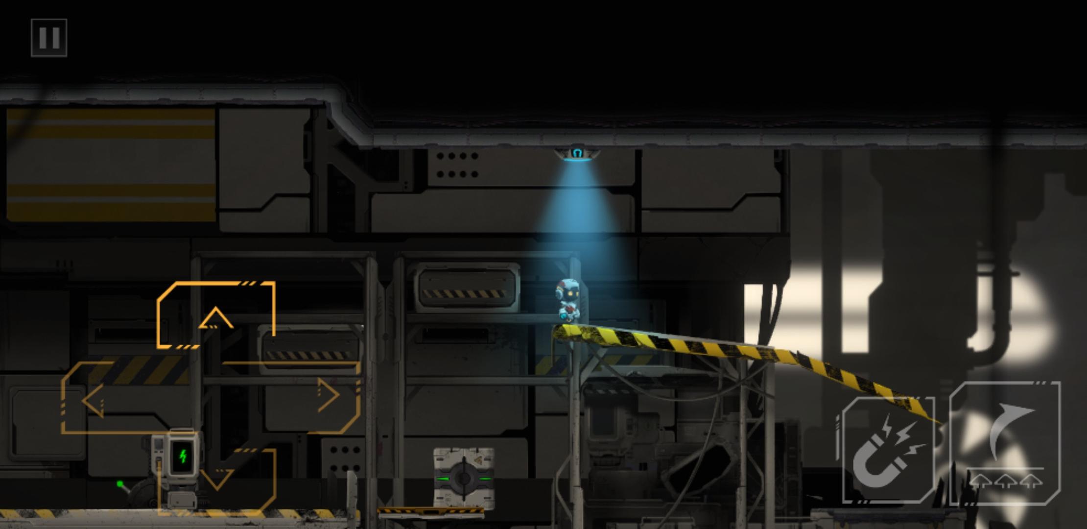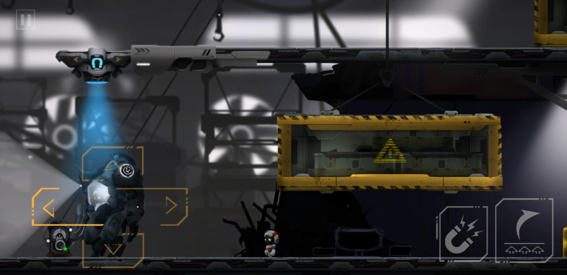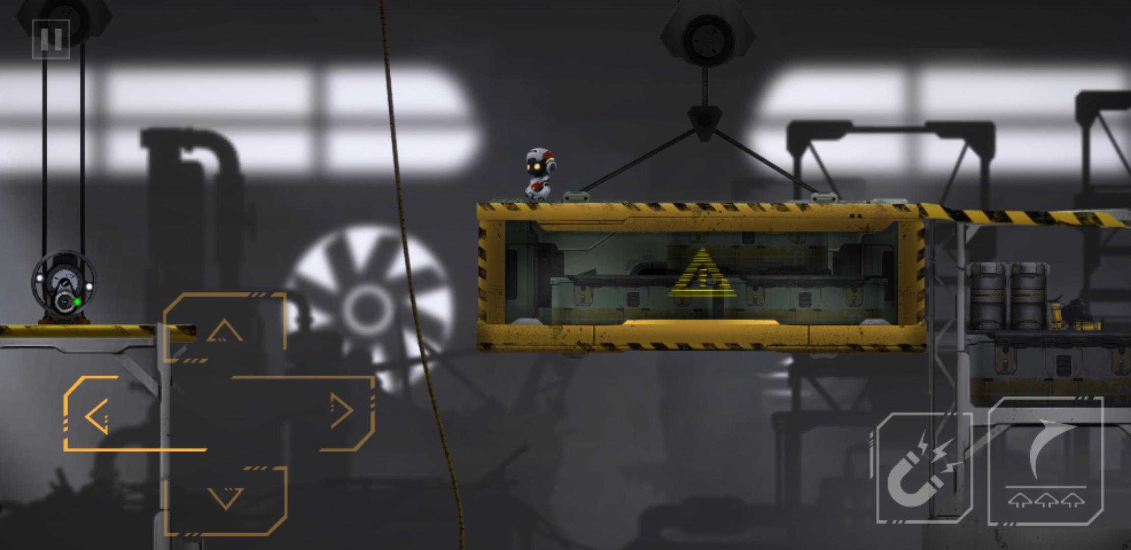 接下来是守卫关卡,以下是优化(最容易操作)的通关流程:先搭乘磁吸盘(不是吸住是搭乘)到右边,继续搭乘到靠近左边(但是没有挨到左边平台)时,跳下去触发警卫警报,警报变红,此时保安即将过来,磁吸盘还在头顶位置,直接吸到磁吸盘上,来到右边滑轮处跳下,乘着保安在左边搜寻的空档,用滑轮吊起右边地上的集装箱,松开滑轮跑到右边