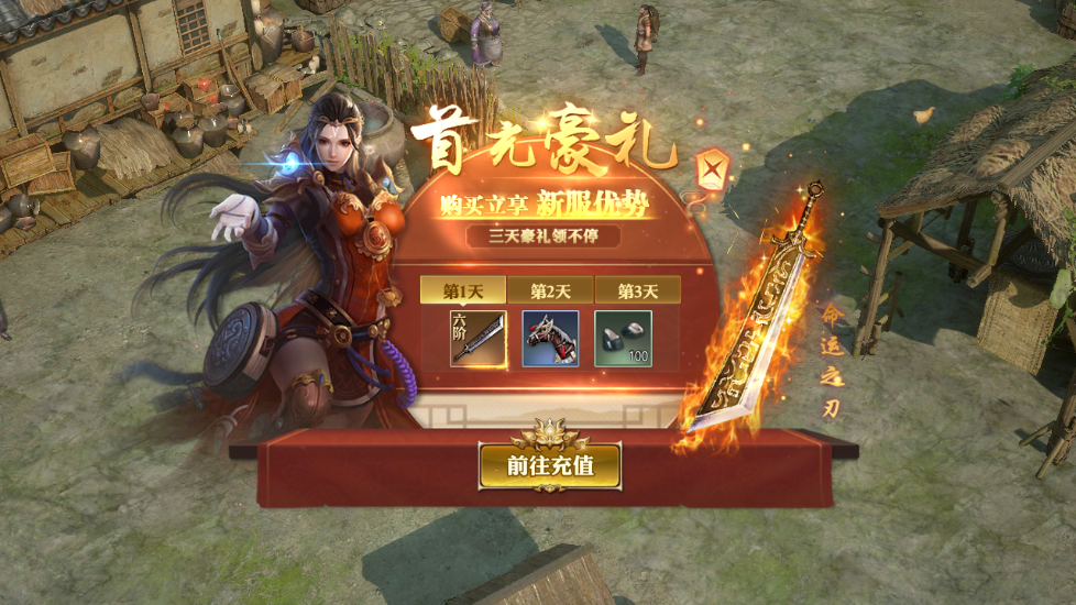 首充任意金额即领六阶装备、稀有坐骑、超额绑元等海量奖励!各类福利连续领取三天,助你建立初期优势,轻松完成主线任务,开服妥妥的快人一步!