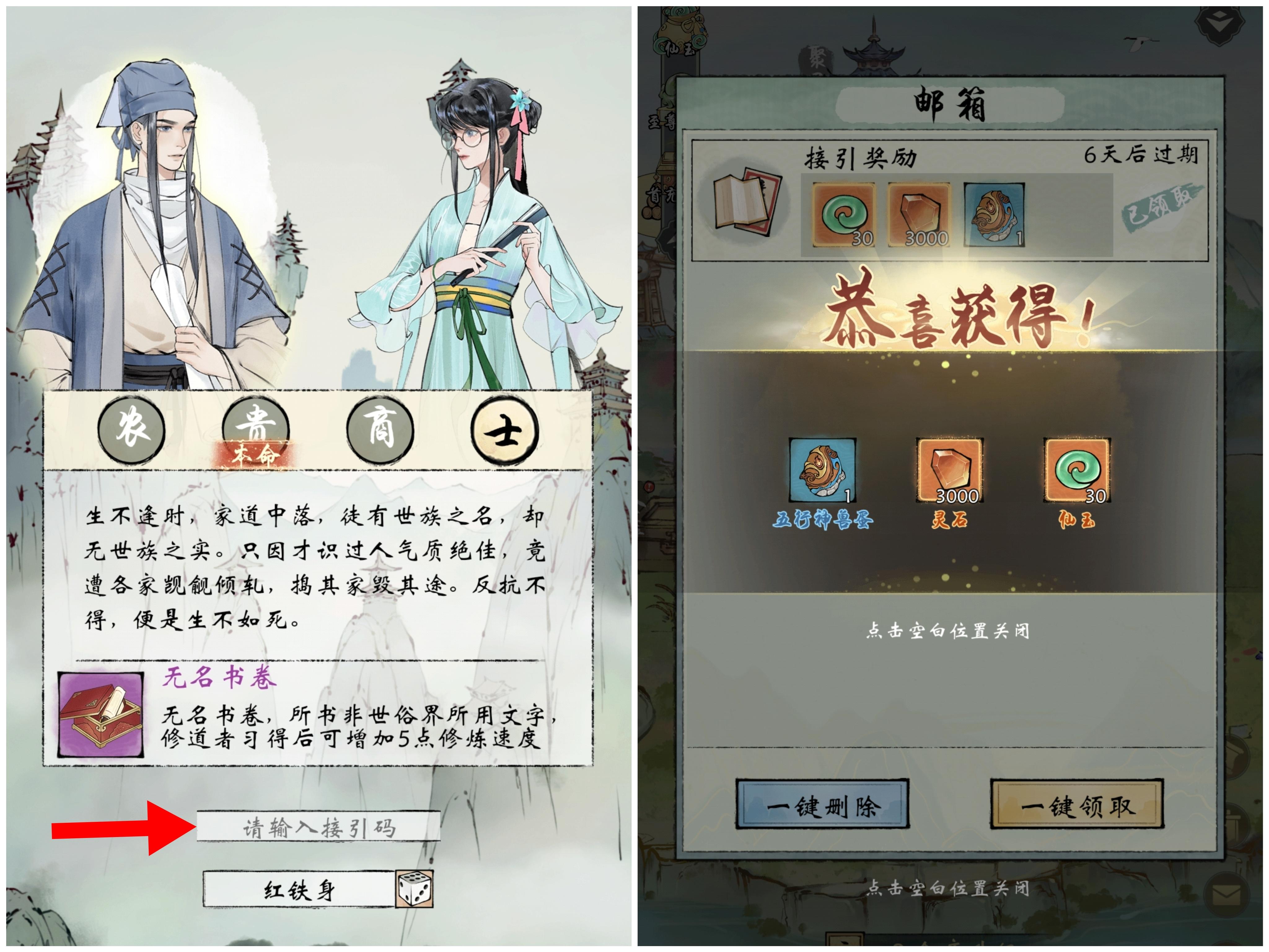 建立角色界面,确定角色名处上方可输入接引码,进入游戏后可通过邮件获得被接引奖励。接引码由其他已达筑基期玩家提供。
