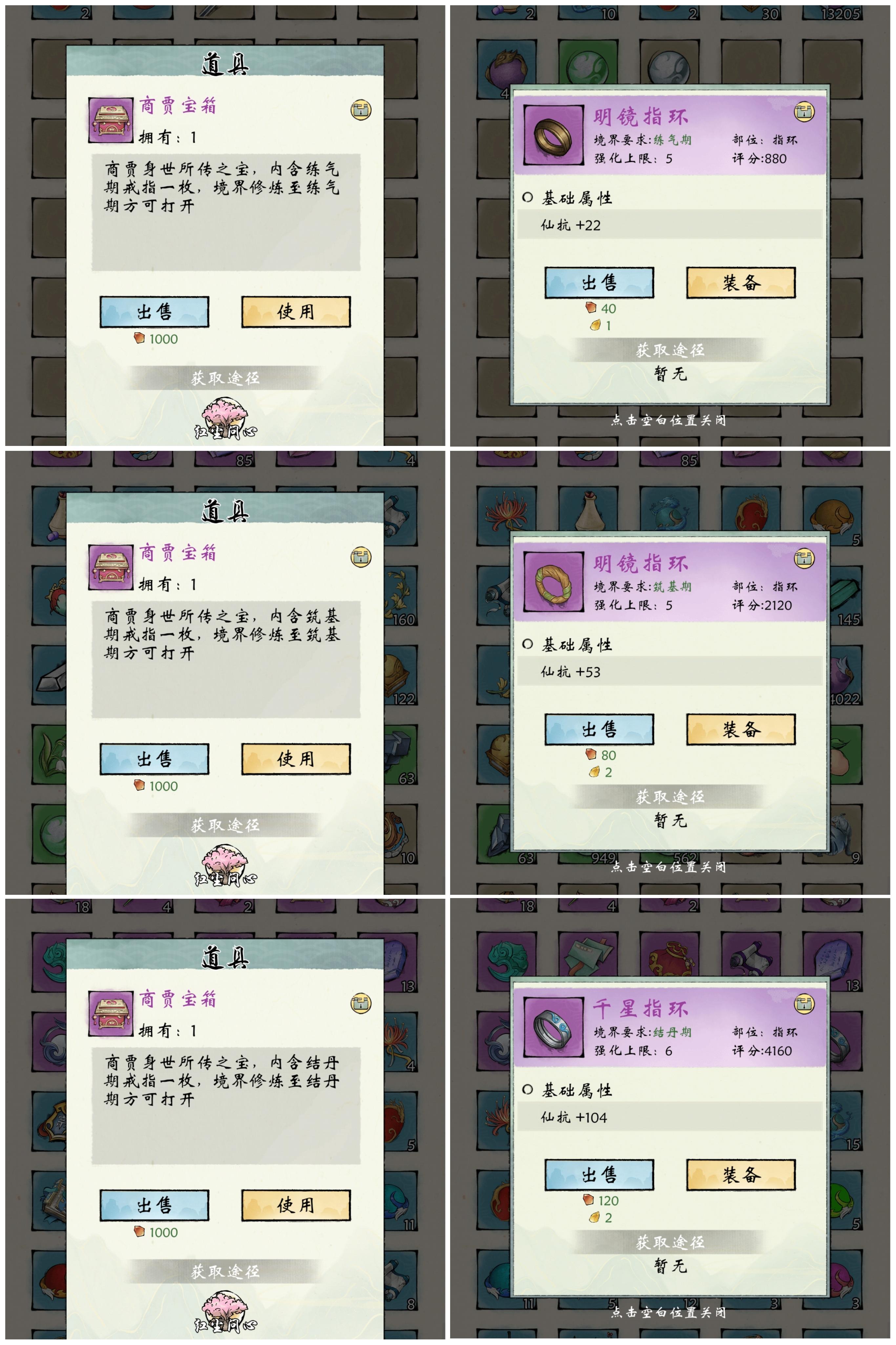 (3)商贾:商贾宝箱,内含练气期戒指一枚,紫色装备;后续筑基、结丹、元婴期可以继续打开,仍然是紫色装备戒指,仅提供仙抗,基本没有用武之地。