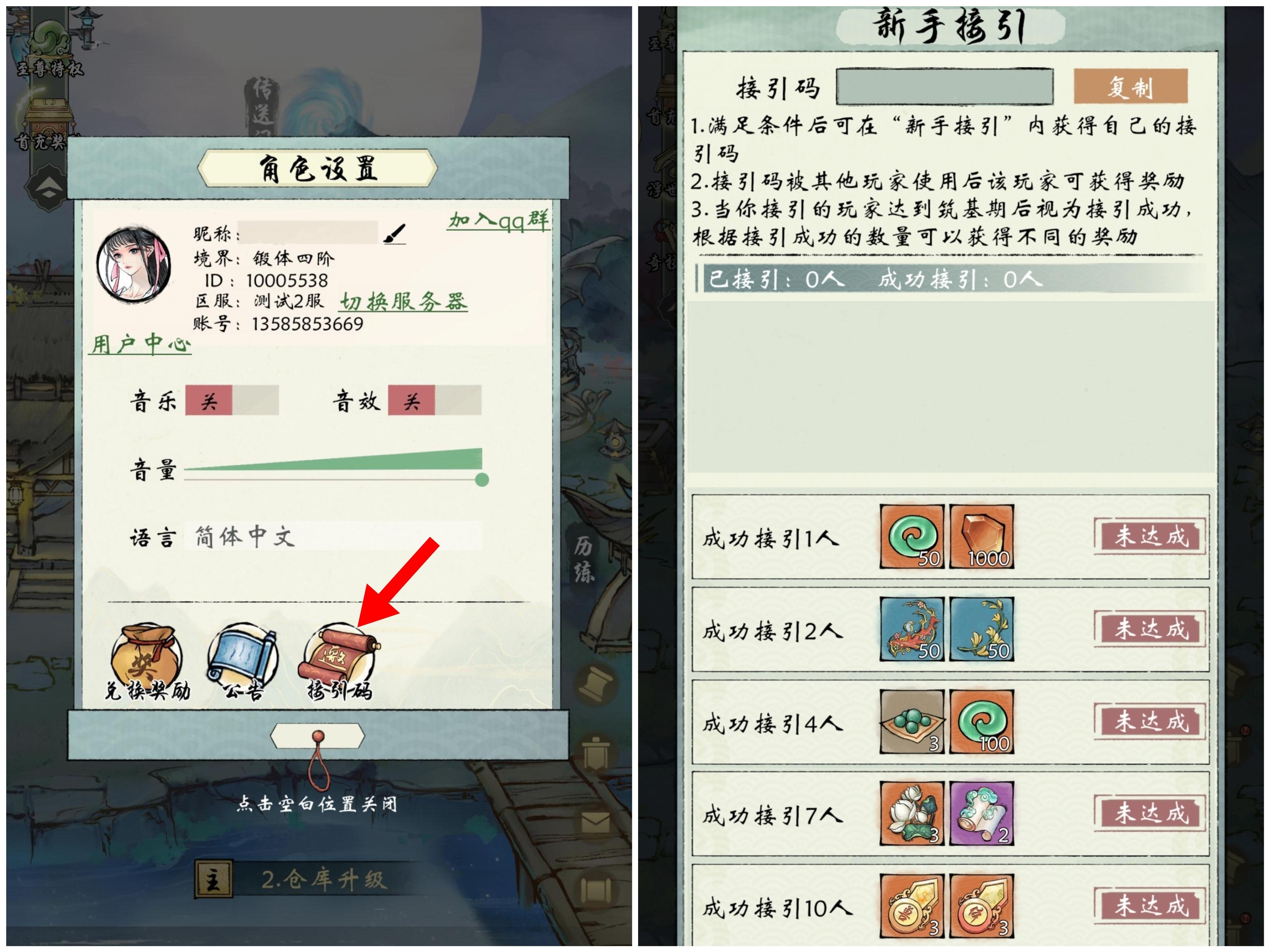 在游戏内达到筑基期,可到主页点击角色头像到“角色设置”页面,点开接引码界面将自己的接引码复制,分享给其他准备新建角色的玩家,当被接引者达到筑基期后即为接引成功,接引者可按接引人数获得奖励。