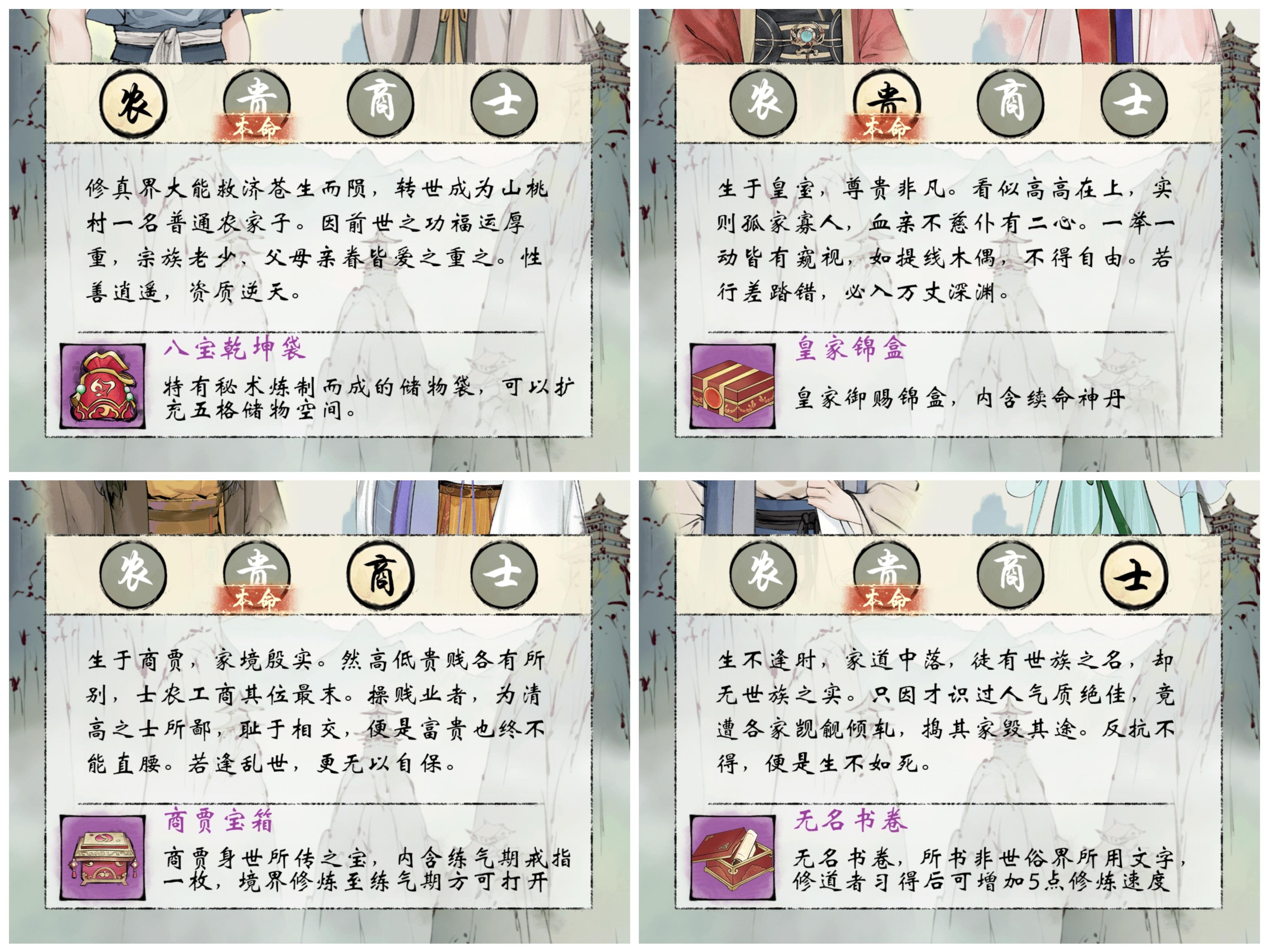建议:自选身世选择皇室或士族最佳,任选其一,农民次之,商贾最次。自选身世开局所获物品数值较低,没有影响也不大,因此“选错了”也完全不要紧。