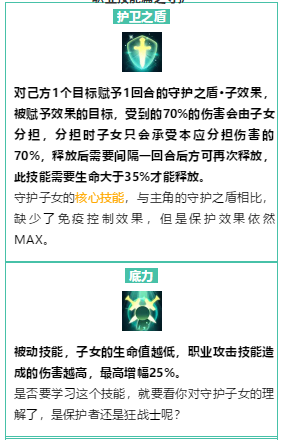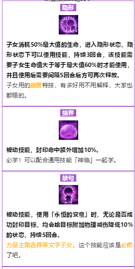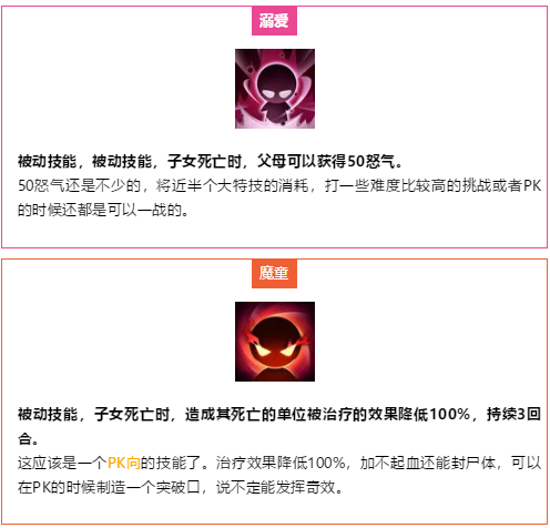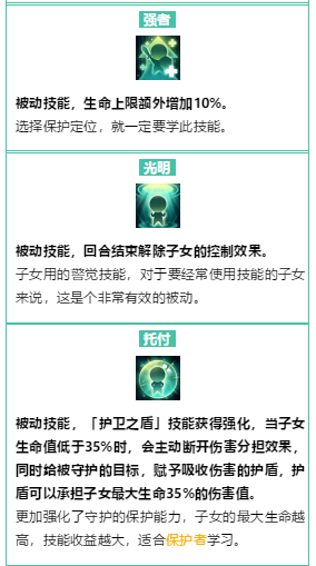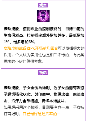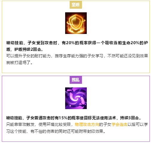 到底要选哪个技能来学习,根据自身情况来看吧,比如你是个输出职业,决定养个奶系的娃,肯定优先加生命加防御抗封,对吧。如果养个输出的娃,那肯定加相应属性加暴击之类的,当然,也可以配合自己装备和魔法兽来,比如你经常用特技,那个加50怒气的「溺爱」就是首选了。主要就是看你想怎么打配合加强哪块能力了。