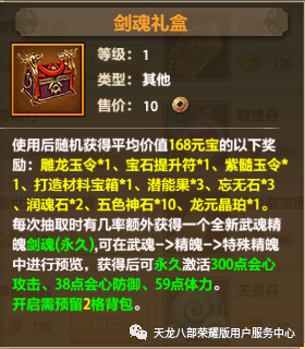 使用后随机获得平均价值168元宝的以下奖励:雕龙玉令*1、宝石提升符*1、紫髓玉令*1、打造材料宝箱*1、潜能果*3、忘无石*3、润魂石*2、五色神石*10、龙元晶珀*1。每次抽取时有几率额外获得一个全新武魂精魄:剑魂(永久)