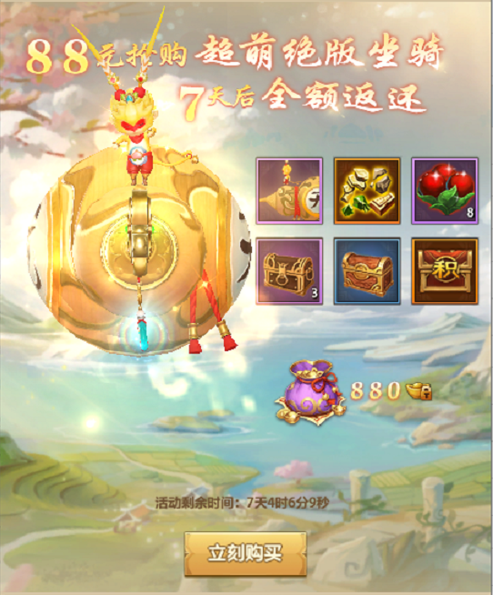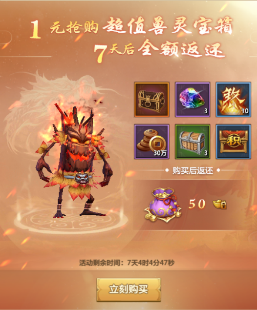 活动期间,玩家可以在该页面购买兽灵宝箱(1元)和绝版坐骑(88元)。购买七天后将返还对应宝箱的绑元数。