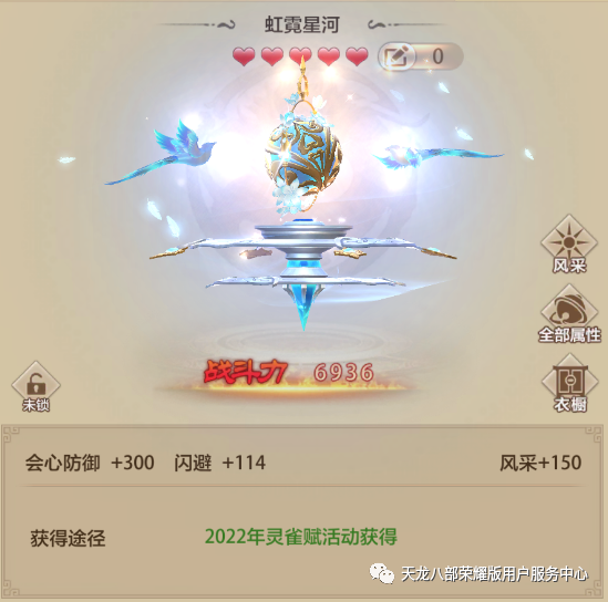 武魂精魄:虹霓星河奖励丰厚!小师妹认为最值得一讲的还属武魂精魄!除了150点风采,本次的精魄还增加300点的会心防御属性!了解武魂的少侠想必都知道,精魄中幻化属性加成会心攻击比较多,会防的增加途径相当稀少。需要的少侠就可以抓住本次活动!在大部分侠士都使用增加会心属性时、少侠你的是会防加成!这不就大大削弱对方的伤害了吗?