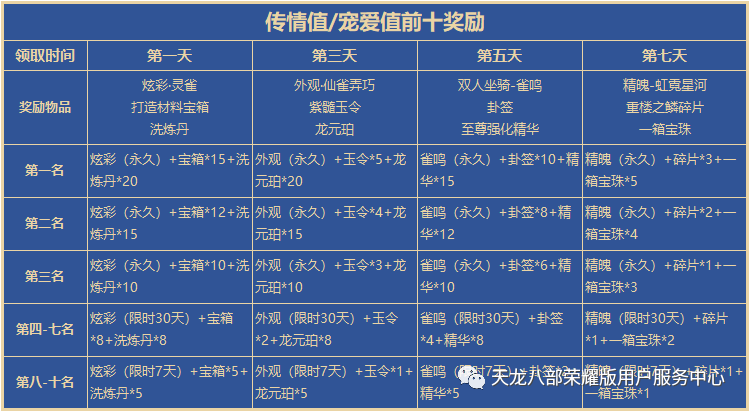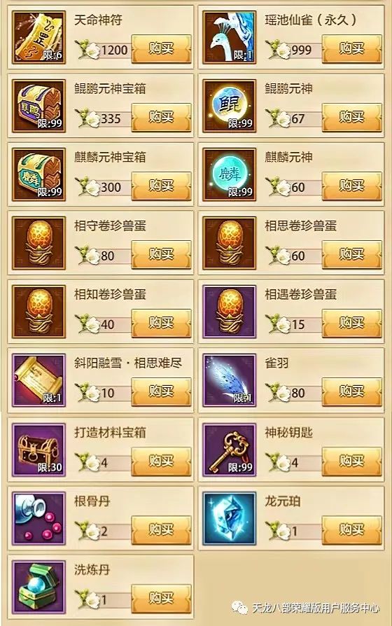 天命神符(限6次)、瑶池仙雀(限1次)、鲲鹏元神宝箱(限99次)、鲲鹏元神(限99次)、麒麟元神宝箱(限99次)、麒麟元神(限99次)、相守卷珍兽蛋、相思卷珍兽蛋、相知卷珍兽蛋、相遇卷珍兽蛋、“斜阳融雪·相思难尽”(限1次)、雀羽(限1次)、打造材料宝箱(限30次)、神秘钥匙(限99次)、根骨丹、龙元珀、洗炼丹。