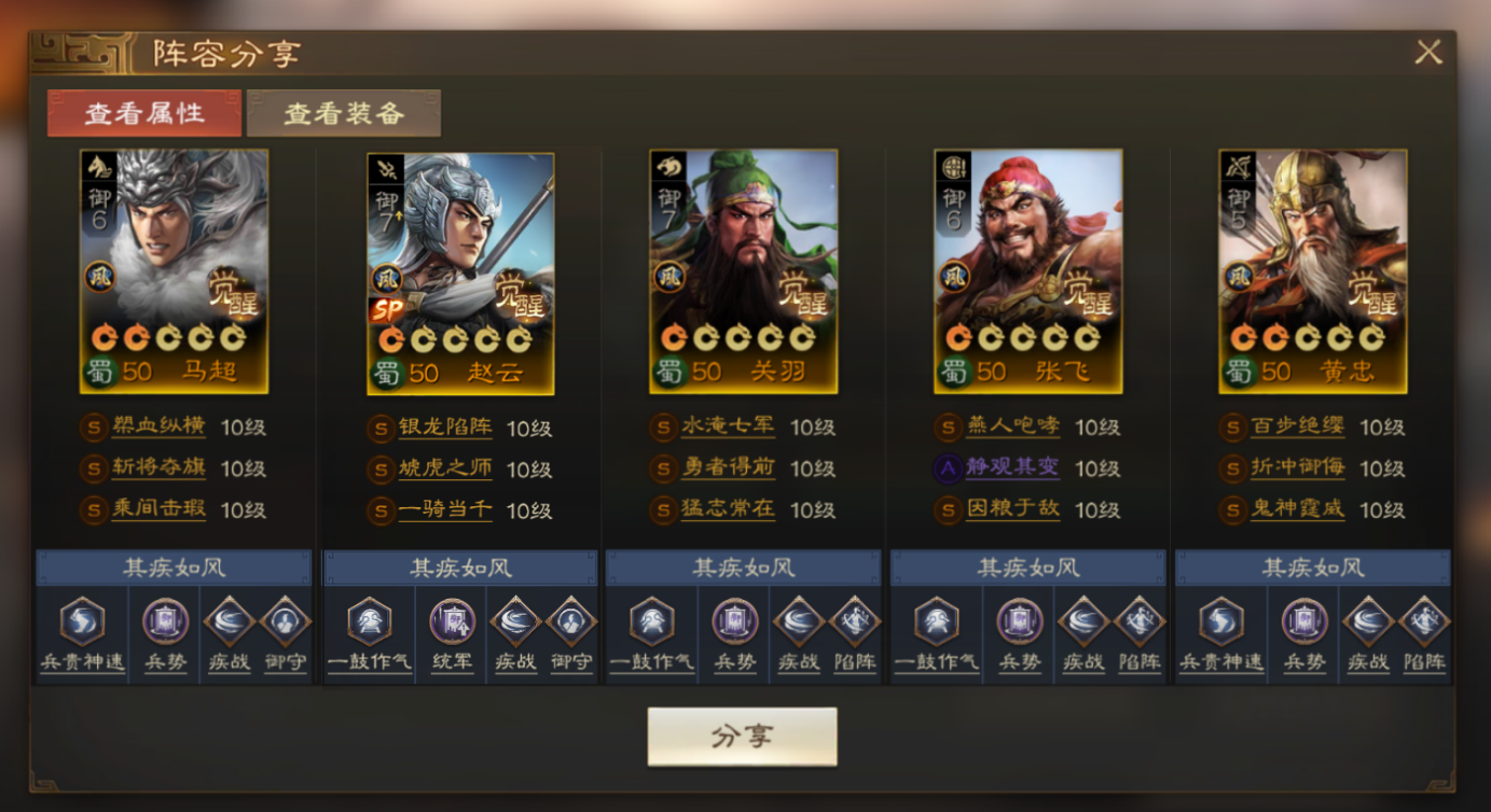 在没有【威临敌阵】时,基本要从五虎羁绊上考虑组队,关羽+张飞+刘备触发桃园结义羁绊,关羽+张飞+SP赵云触发五虎上将羁绊,然后孙尚香和刘备触发吴姬望蜀羁绊。这个队靠五虎羁绊以及SP赵云的特性上【虎威】,然后靠SP赵云自带【银龙陷阵】触发【虎威】,主要输出为孙尚香和SP赵云。