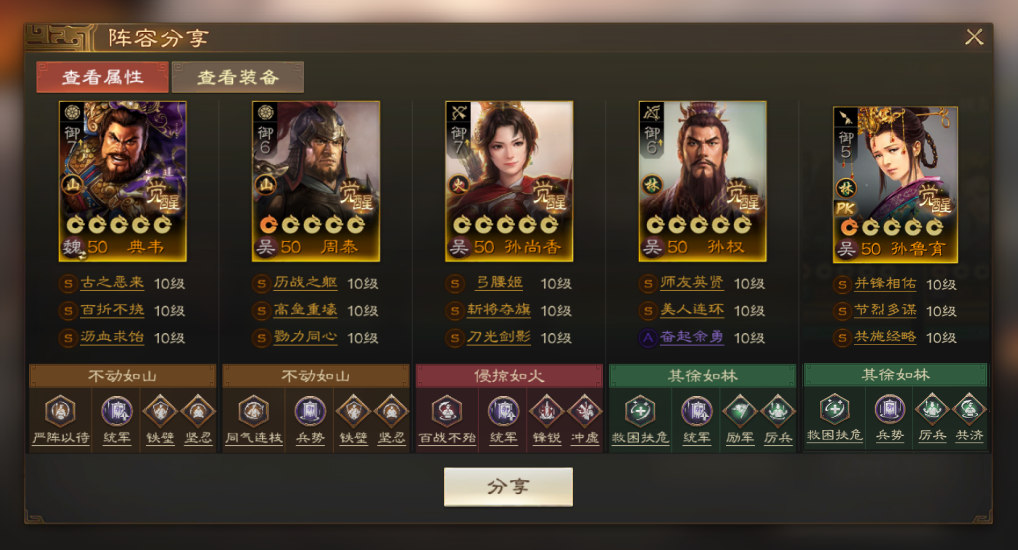 本套阵容的雏形来自于富贵弓,周泰和典韦为我军的坦度提升保障,孙权和孙鲁育则在后方辅助孙尚香,最后加一手【节烈多谋】以及【美人连环】提升本套阵容的容错能力,对于没有抽到SP甘宁的伙伴来说简直就是巨大的福音。