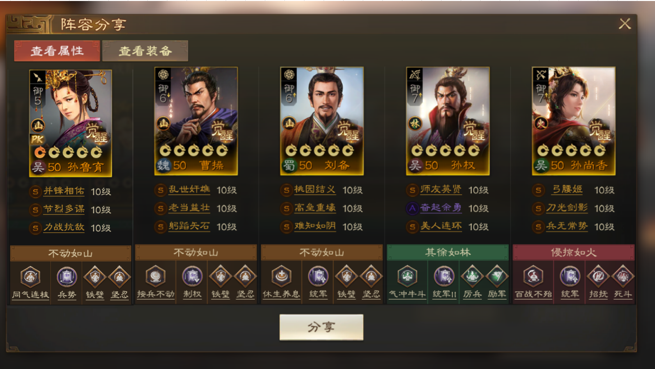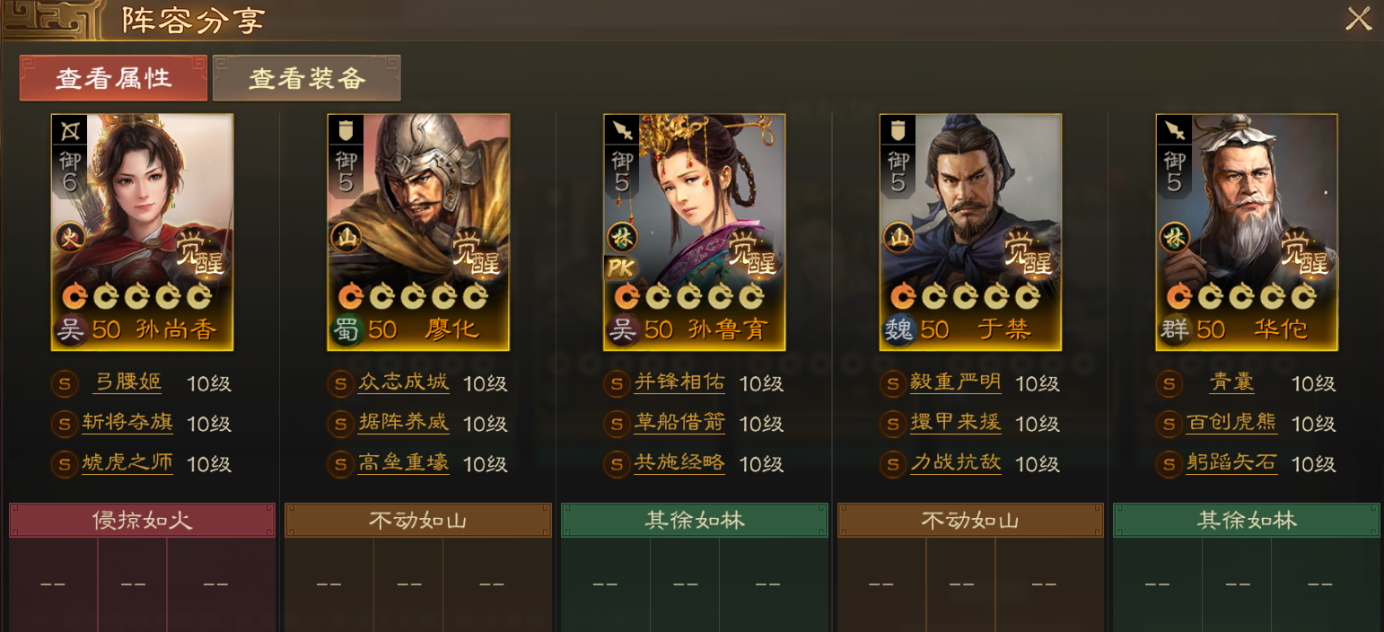 孙鲁育加入原本的富贵弓阵容,为孙尚香提供属性加成,同时也能给孙尚香和自身超高护盾。配合陆逊&陆抗的保护,让这套单核阵容对核心输出武将的属性增益和保护都获得了提升,搭配SP甘宁更从容的偷取敌方属性。