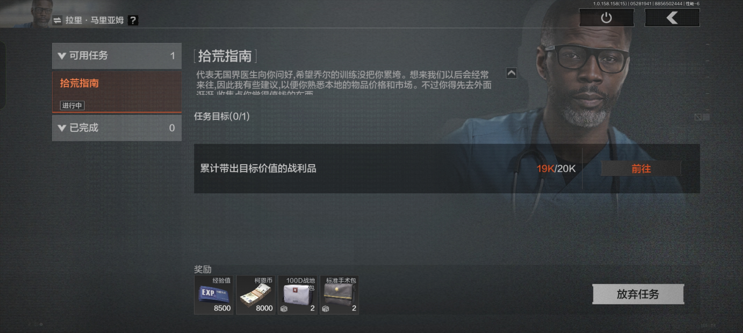 拉里的任务没什么要求,带出一定价值的物资即可;之后就能领取高档医药制品,基本等于白送,千万别忘了领!