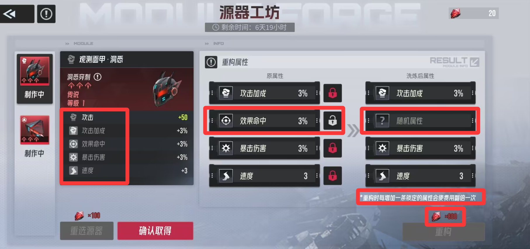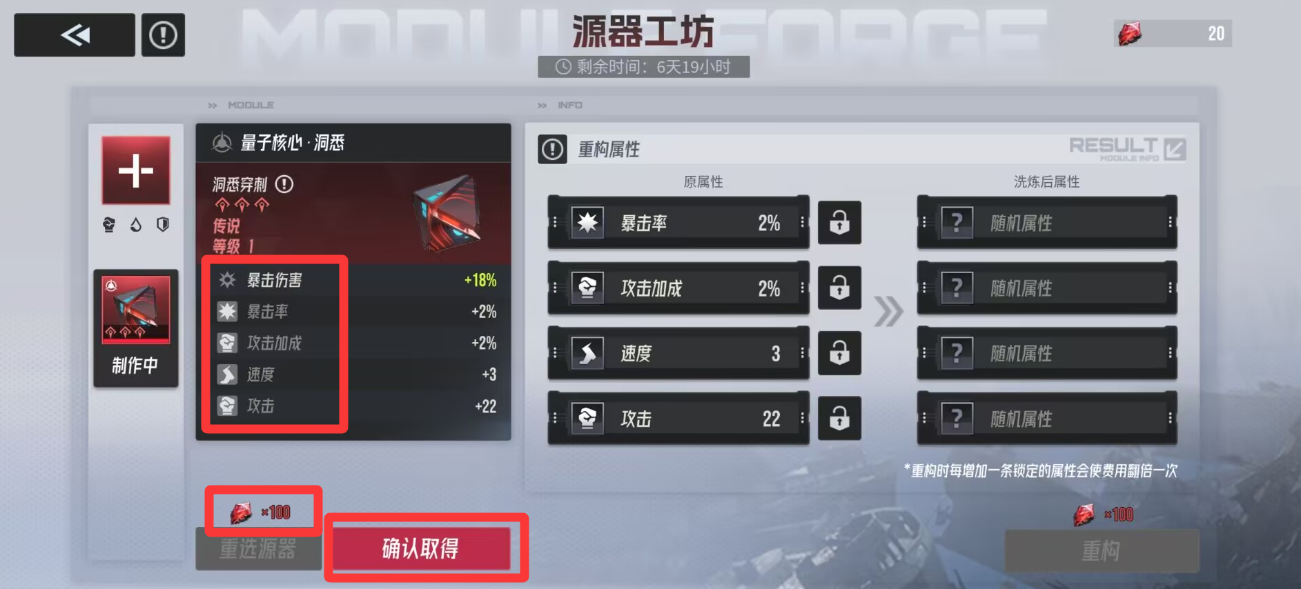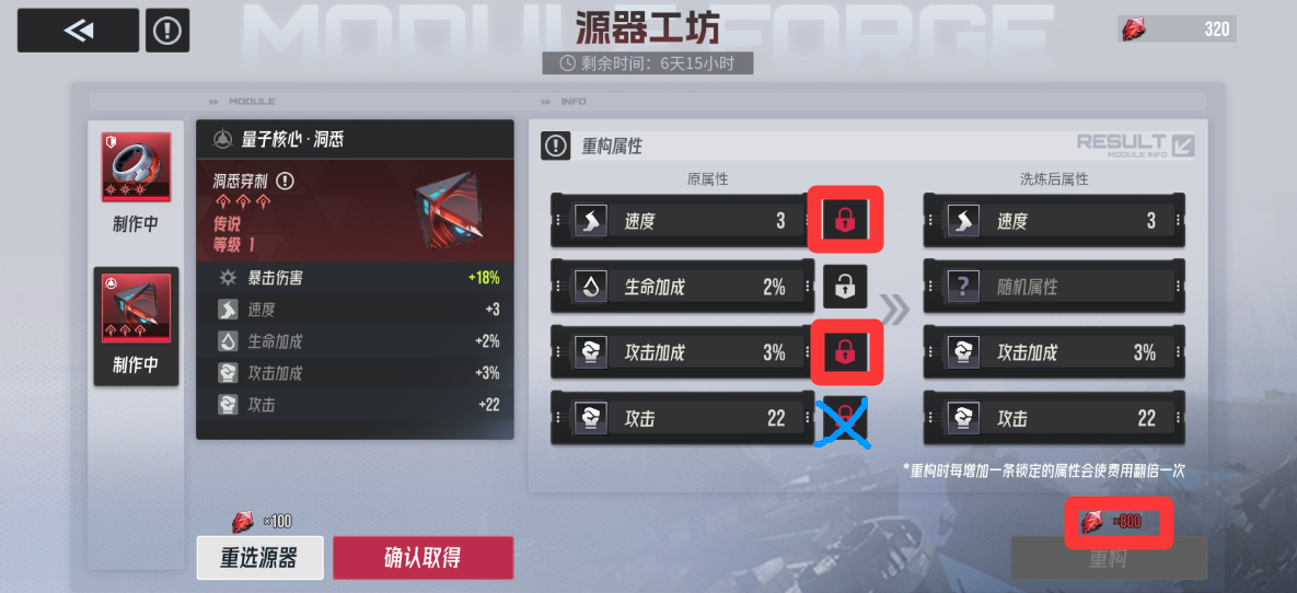 那么就可以选择锁二,如下图,舍弃掉小攻击的属性,来选择重构更为重要的暴击属性。