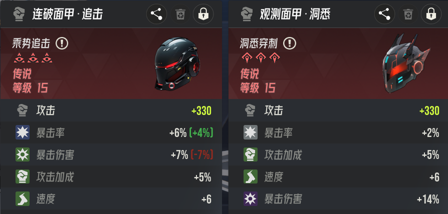 第二个我选择了洞悉穿刺的面甲,因为这个位置可以出现完美词条:暴击+爆伤+攻击加成+速度的组合。