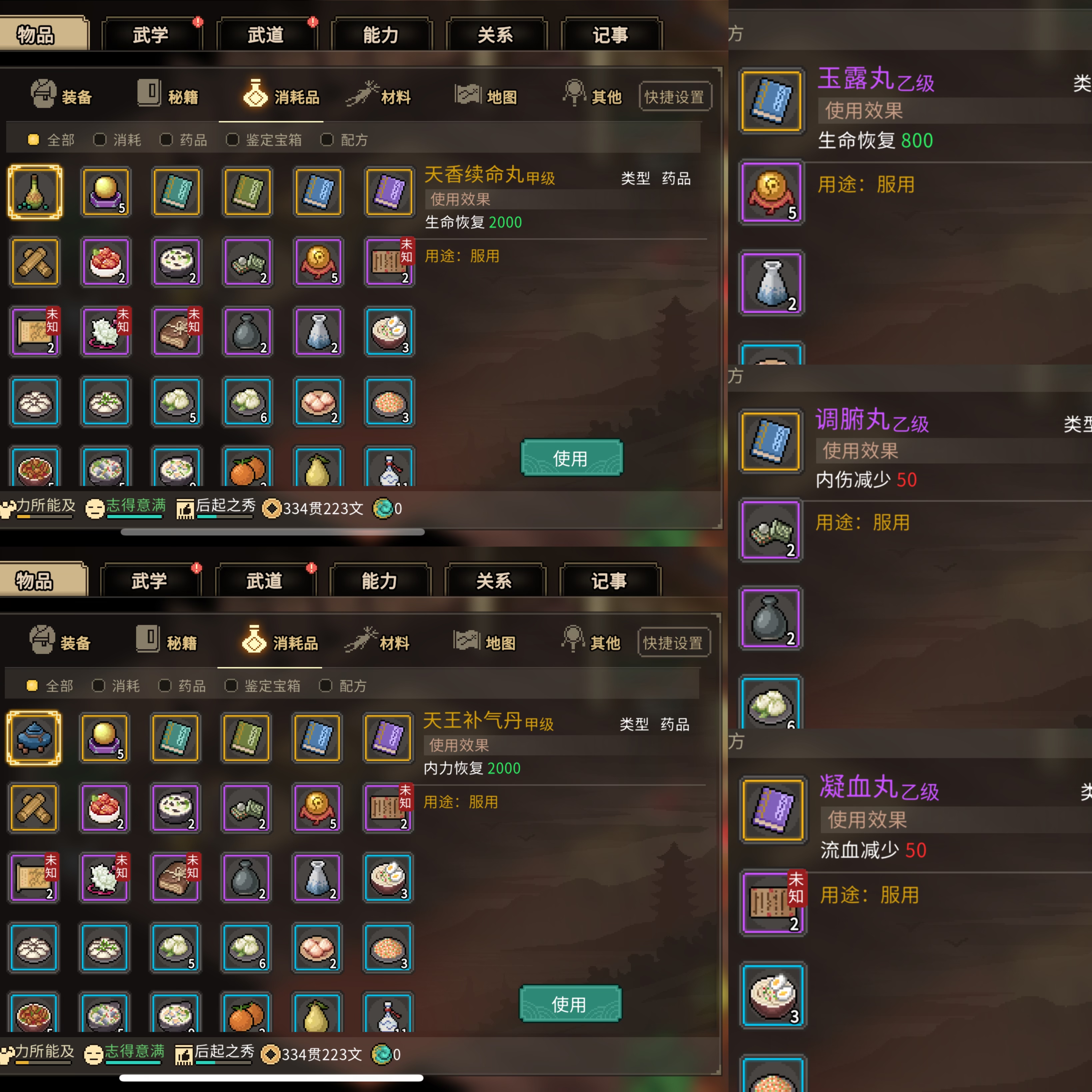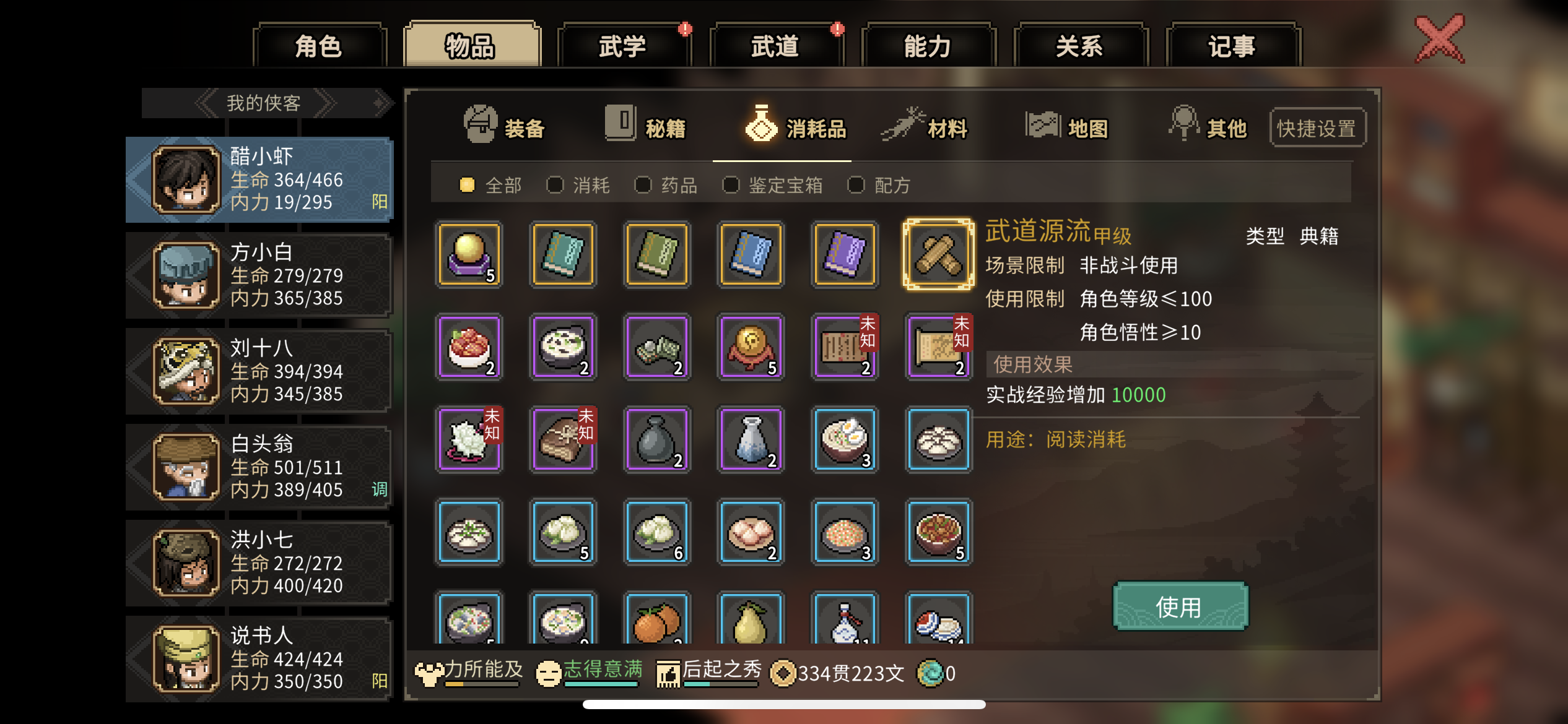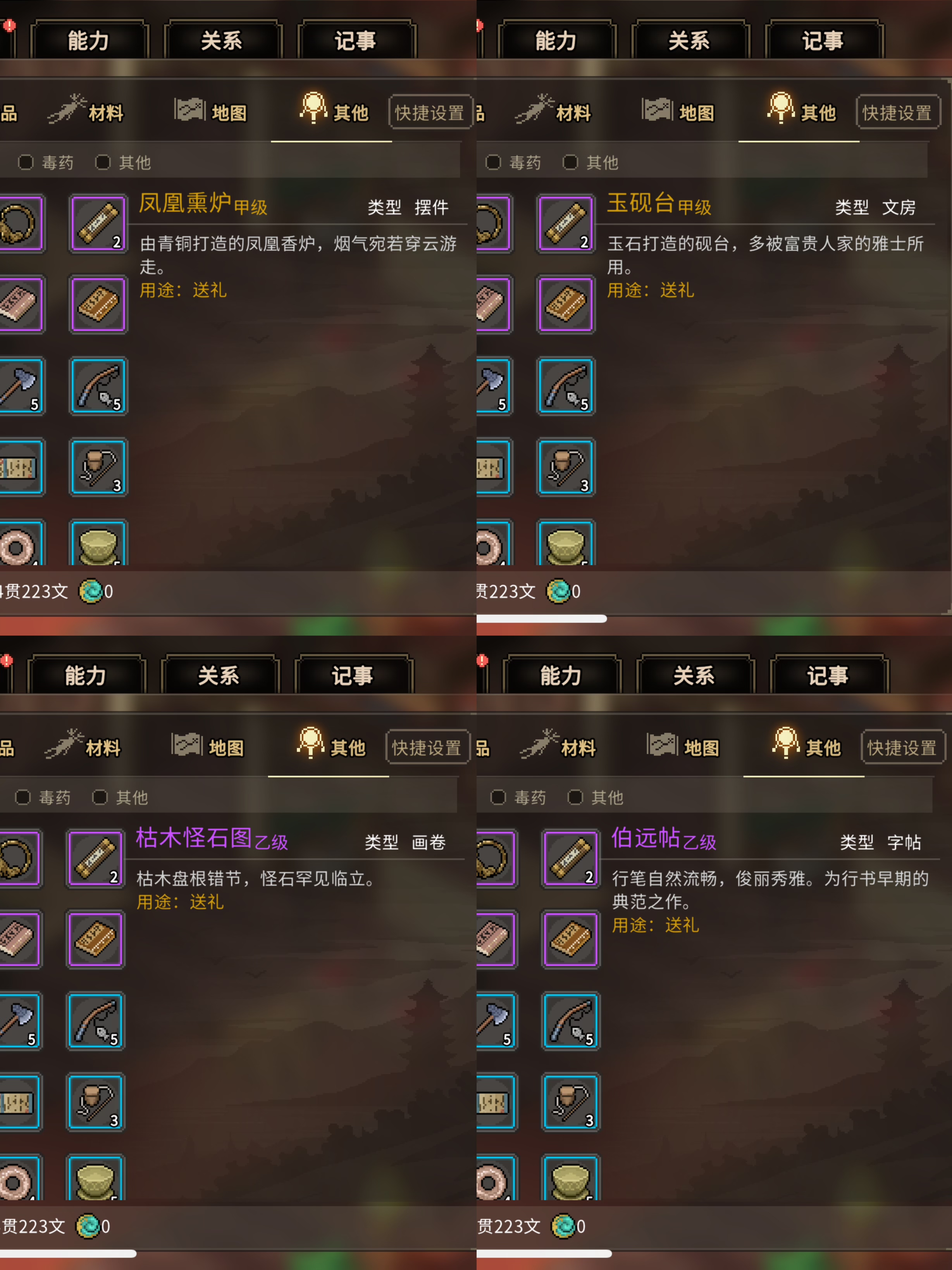 其实前期开局能用上的可能就武道源流和那把紫色武器了,其他的自己看情况易物或者送人都是不错的