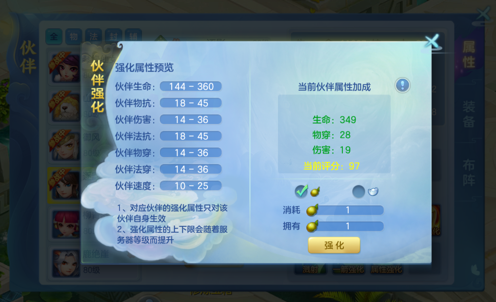 6、伙伴:限“倾城之恋”服务器生效,新增了伙伴属性强化。