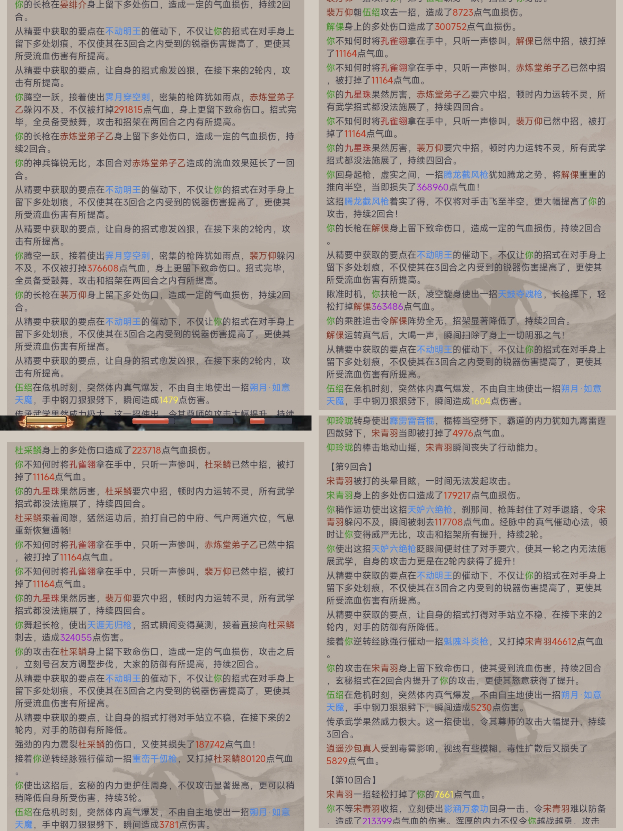 3. 重点说一下刀爹(3星18级),偶然洗出了个增加挡刀,突发奇想:要是刀爹挡了小怪没挡大怪,不就有很大概率开出刀传了吗,于是挡刀拉满86%,实战效果如下图,5人组刀爹功不可没;这个的前提就是有相当的控制,有一定把握在第3回合大怪没出招;