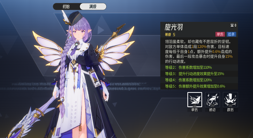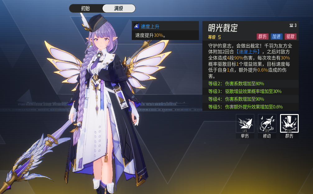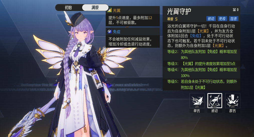 满级技能之后:若千羽自身未处于不可行动的状态时,则会额外为自己附加1层【光翼】就是2层【光翼】