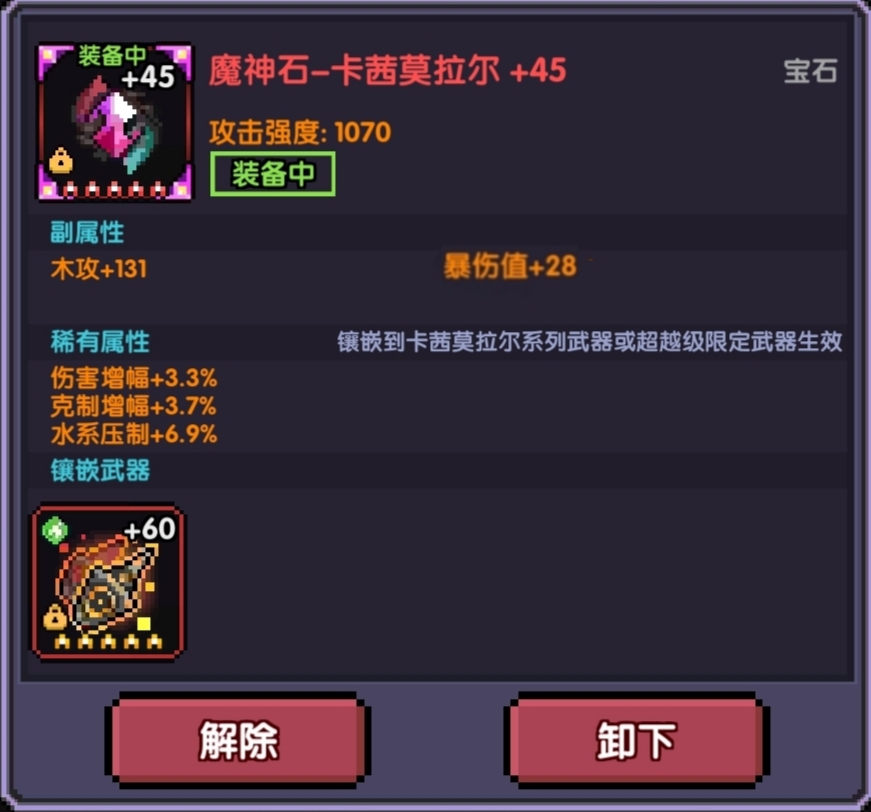 因为世界所需要的元穿不高,保持在2500左右就好了,所以只需要主武器宝石洗成元穿+属性攻/爆伤,副武器的宝石可以洗成属性攻+爆伤(资源多的大佬才这样洗,没有满6个通用毕业的就不要这样洗了)