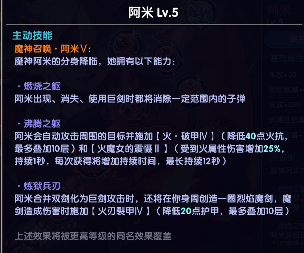 当前版本火系唯一指定魂系,火系全场景均使用该魂系,装载魂珠总星数达到10星后开启技能,满级技能提供400元素抗性削减,200护甲削减,25%火属性易伤
