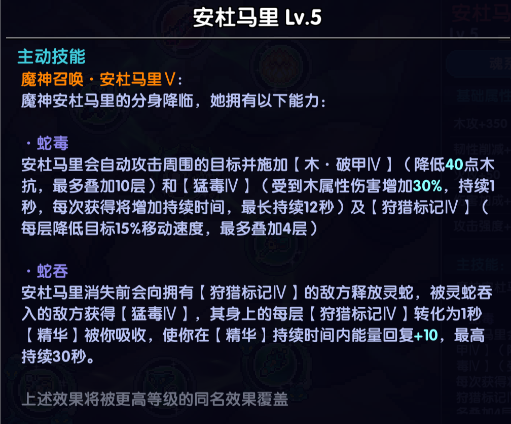 当前版本木系魂系选择之一,装载魂珠总星数达到10星后开启技能,满级技能提供600元素抗性削减,40%木属性伤害加成,60爆伤值,总的来说单人情况下易伤的提升是大于个人面板的提升的,但因为槽位多一个,且触发速度巨快,因此还是推荐新手选择该魂系