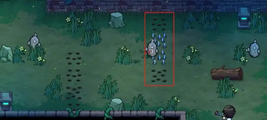 这一排陷阱为经过凸出地刺,我们可以引诱小怪站在上边,在陷阱攻击的同时,我们也发射弹幕攻击小怪。