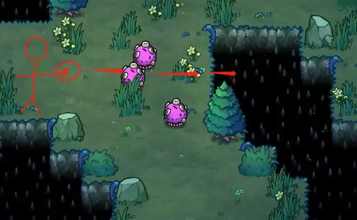 在遇到这样的陷阱时,有一个小技巧,我们可以像下图中一样,利用弹幕击退效果将小怪推入陷阱中进行击杀。该陷阱有秒杀小怪机制。