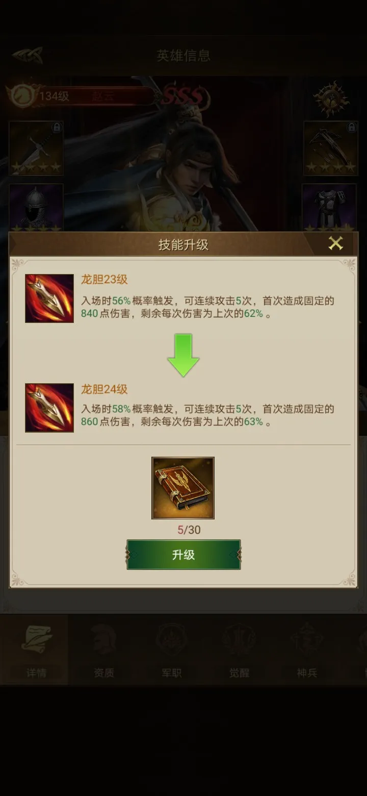 2、军职:提升赵云的军职也可以提升赵云的相关属性。如见图四,赵云每一个阶段所需要的碎片和军阶石,那么,如何获取这些相关的资源呢?