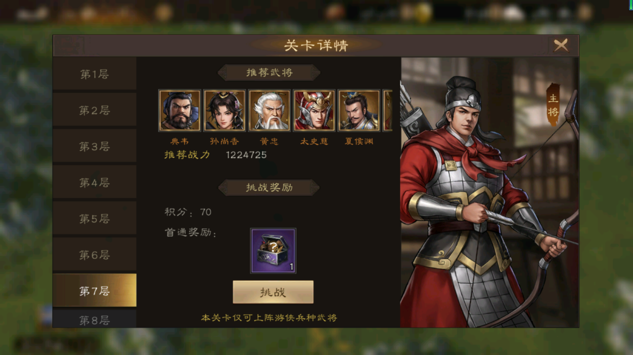 该模式下只能上阵【游侠】类兵种武将。首次通关可领取游侠类兵种的装备随机箱。