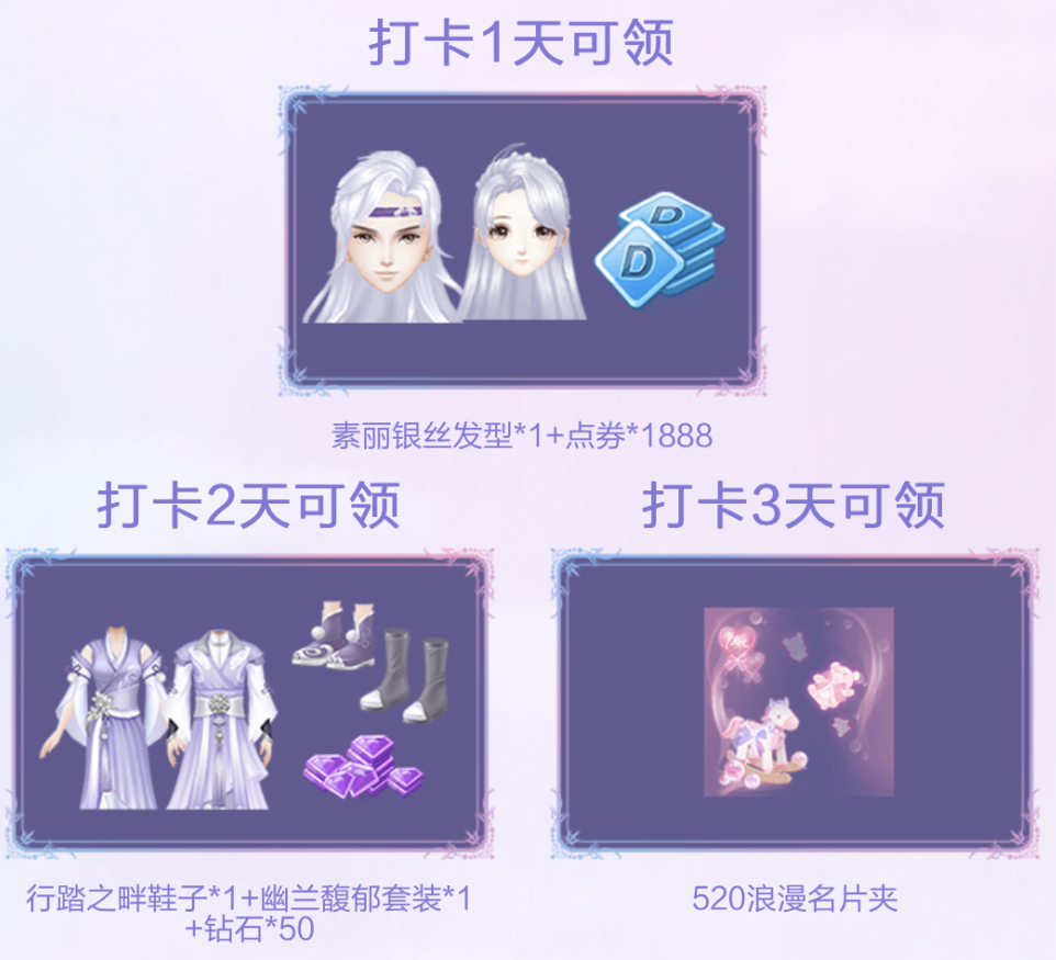 好礼送不停——当天登录游戏并成功分享即视为打卡成功,累计打卡3天还可得组合装&点券&钻石&520名片夹奖励!