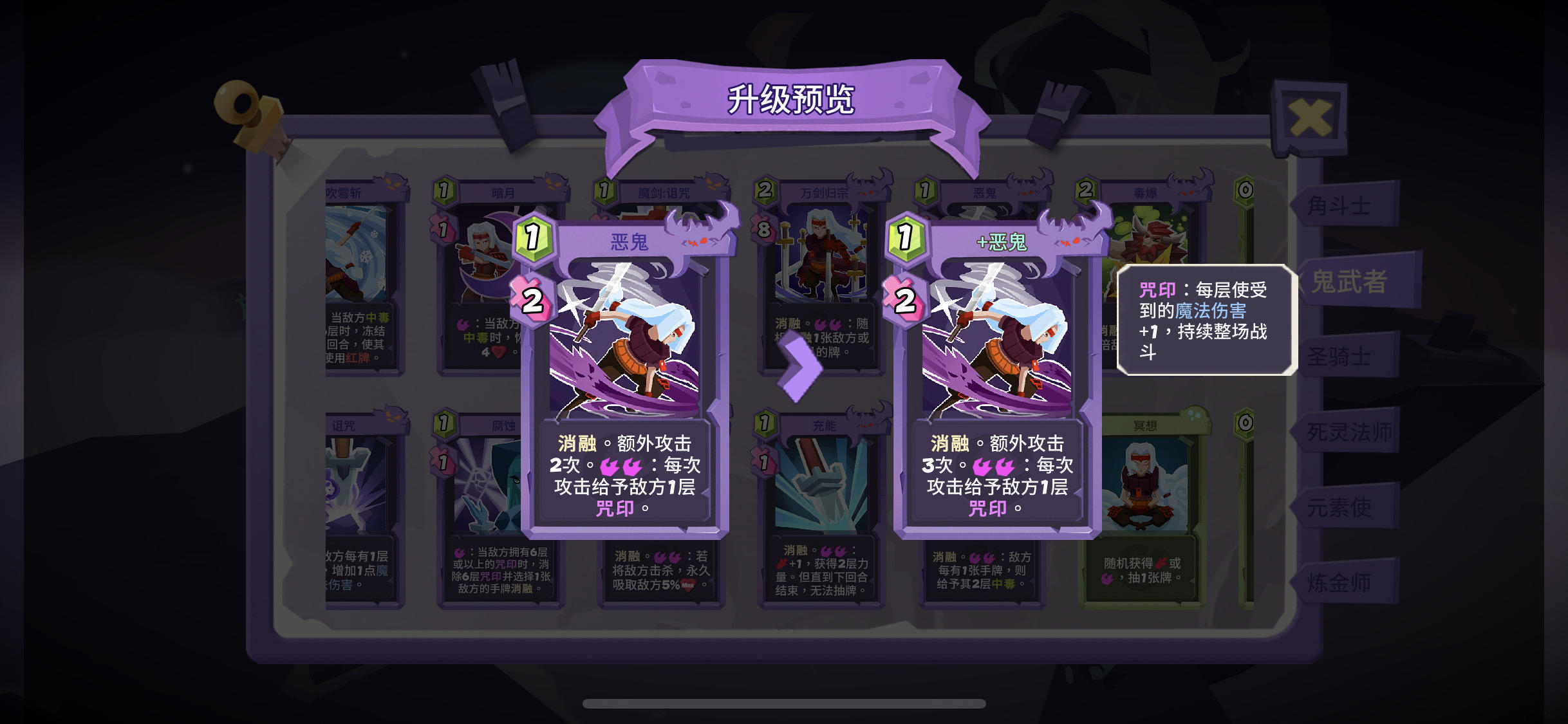 鬼武的进攻牌分为物理魔法(红紫)或者分为单段多段,在不考虑童子切和魔能转换的情况下,一般围绕单方向进行构筑(不推荐多流派共走是因为装备神器卡牌的刷新都是随机,例如毒和暴击双修需要装备浪人服丶头巾等,咒印力量需要刷出童子切和魔能转换,没有替代品想追求稳定过关不推荐)