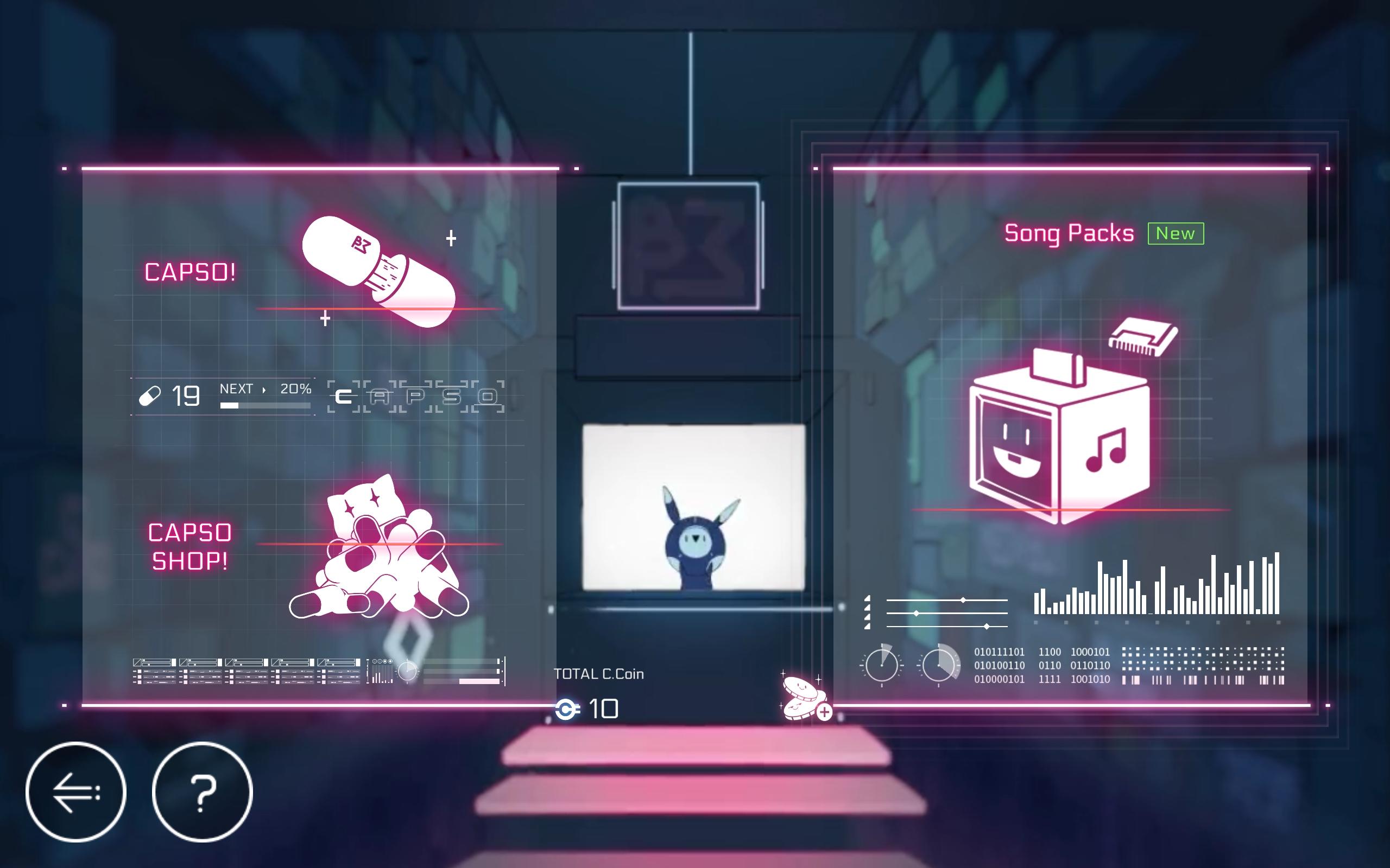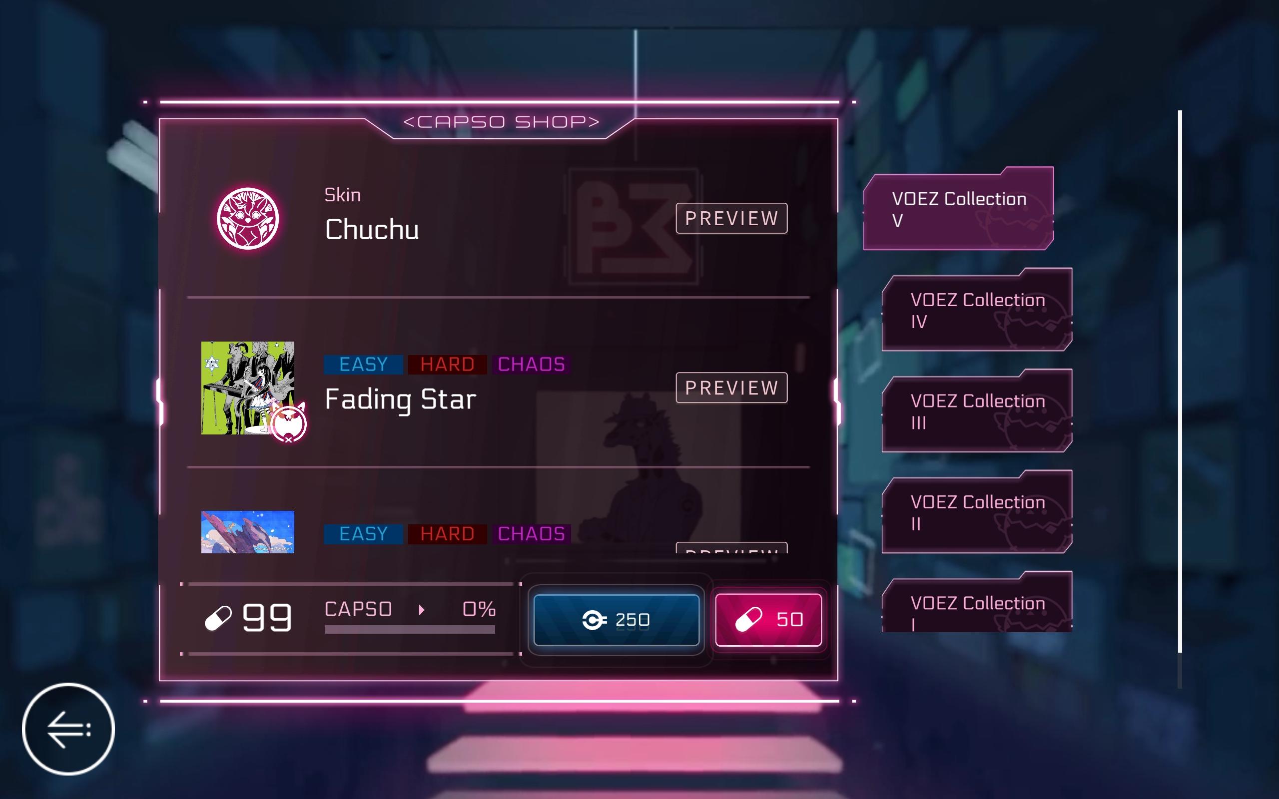 每个CAPSO套装包含1个皮肤和3首曲子(9个谱面),价格为250 C.Coin(25元RMB)/50 CAPSO。