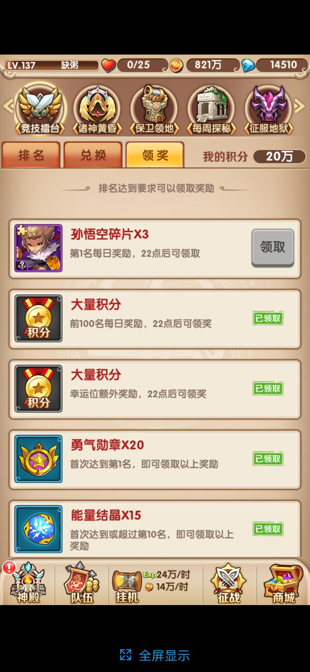 14.竞技场:每天的竞技场第一名送3个猴子碎片,100个能合出猴子,猴子进化斗战胜佛是合成女娲的其中一部分,所以猴子碎片很关键,尽量抢占第一名。不过需要注意的是每晚10点结算。