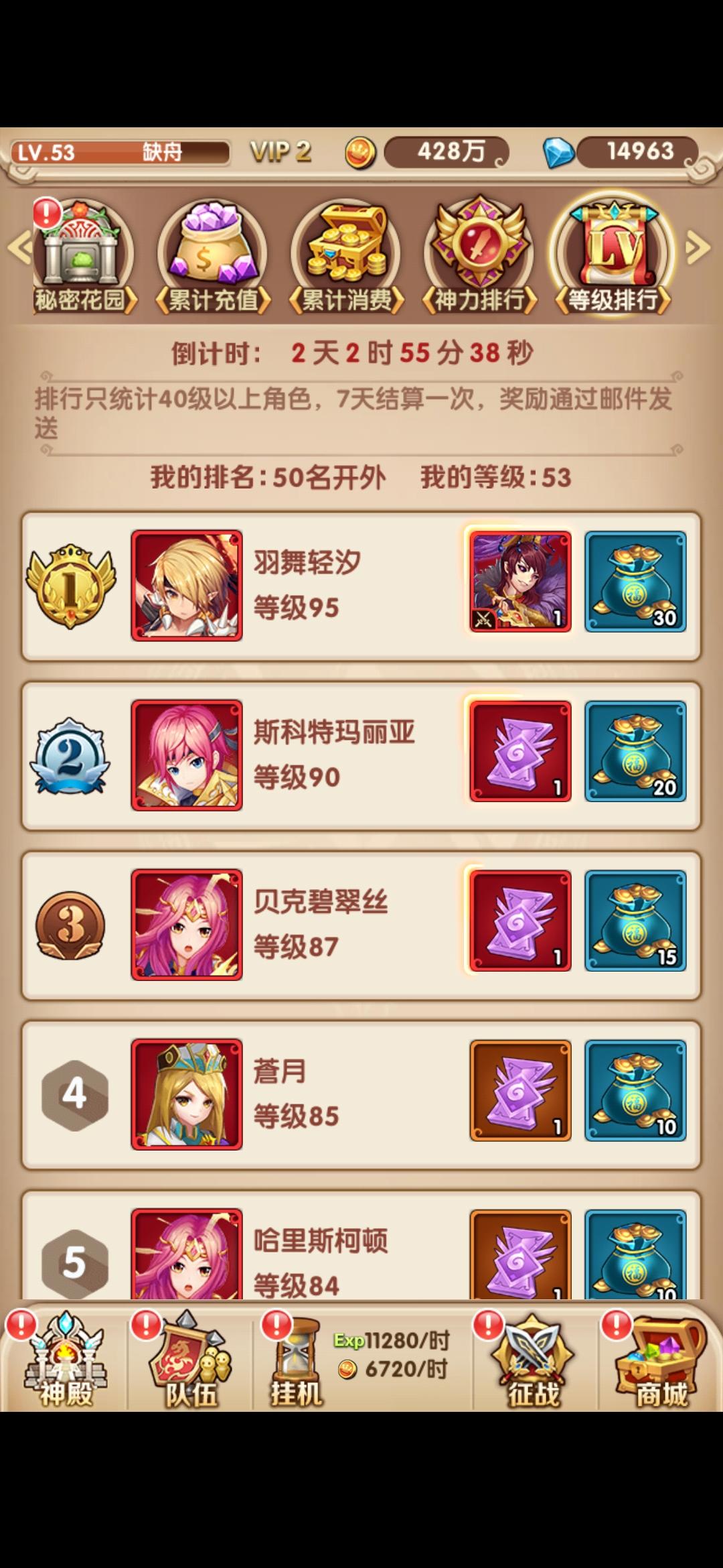 10.等级排行:第一名奖励无天可以合成1个42资质的神将,在前期能用挺长一段时间,所以想当区霸的话一定要抢。