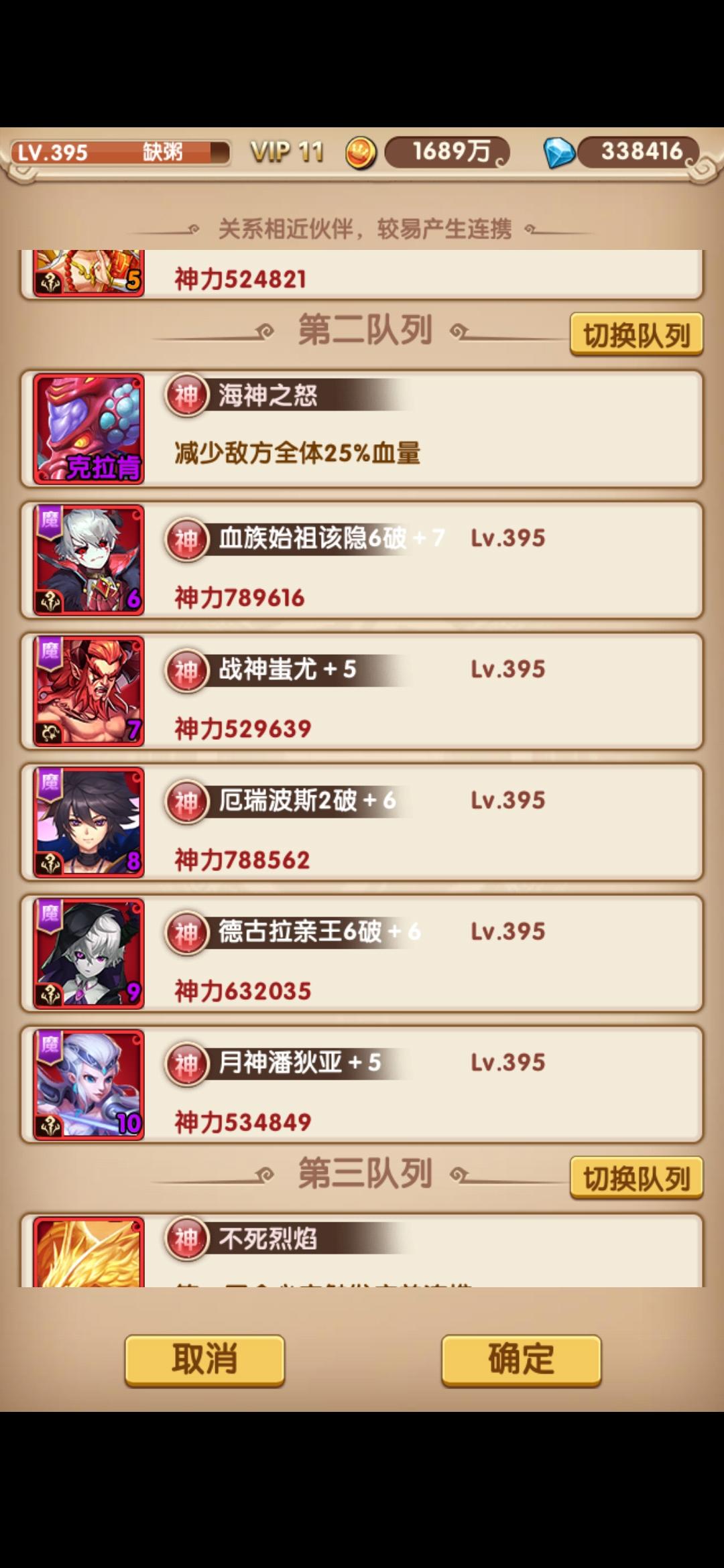 接下来进去正题,由于许多小伙伴比较关心,所以单独来说一下。首先,我把主力队说一下,主要是如下(不包括vip神将,因为vip将肯定强,不然充啥vip,特别是v10以上神将,贼强)。我的主力队主要是如下(v10送的奶妈,v11女神破防将,轩辕黄帝,鸿钧,保护神)