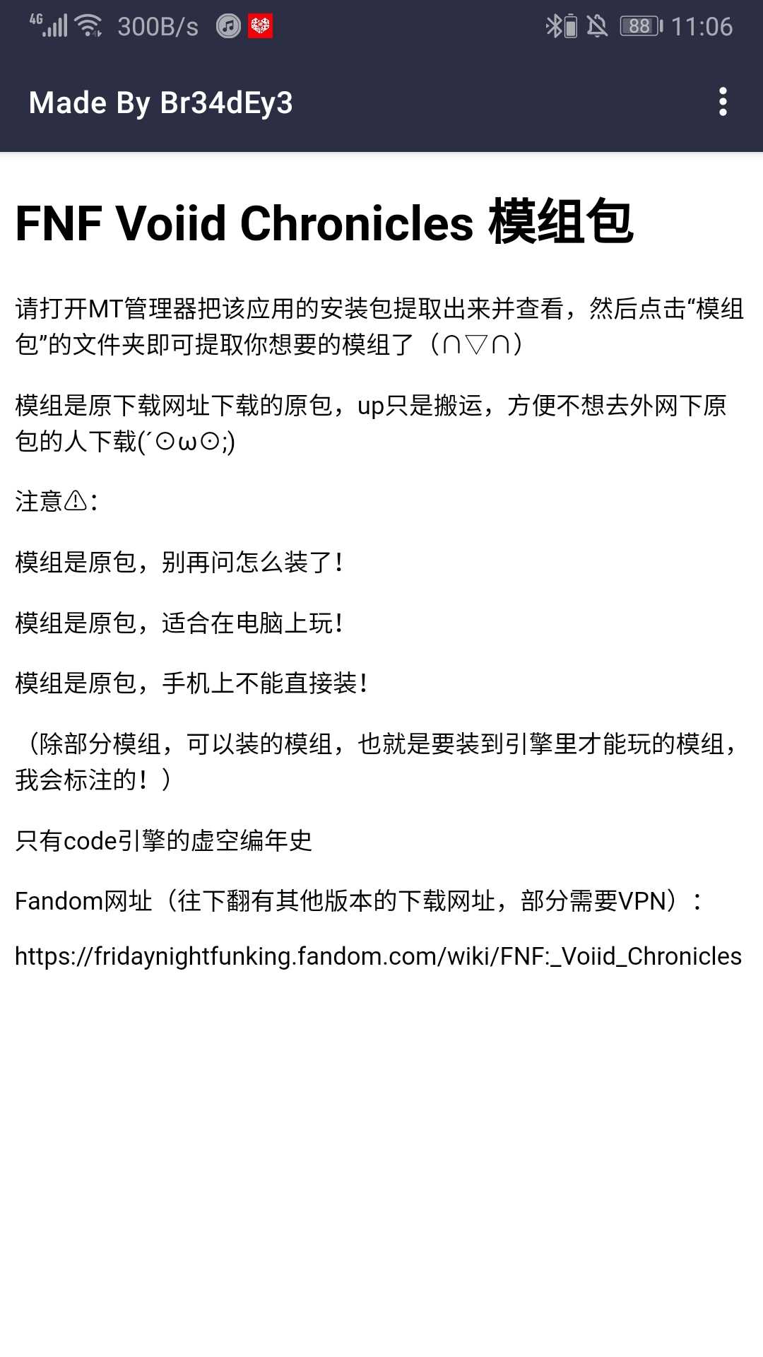 FNF Voiid Chronicles 模组包 下载安装后用MT管理器提取安装包后查看,模组就在“模组包”文件夹里(∩▽∩) 模组是原下载网址下载的原包,up只是搬运,方便不想去外网下原包的人下载(´⊙ω⊙;) 只有一个:Code引擎的虚空编年史。其他的看评论区 注意⚠: 模组是原包,别再问怎么装了! 模组是原包,适合在电脑上玩! 模组是原包,手机上不能直接装! (除部分模组,可以装的模组,也就是要装到引擎里才能玩的模组,我会标注的!)