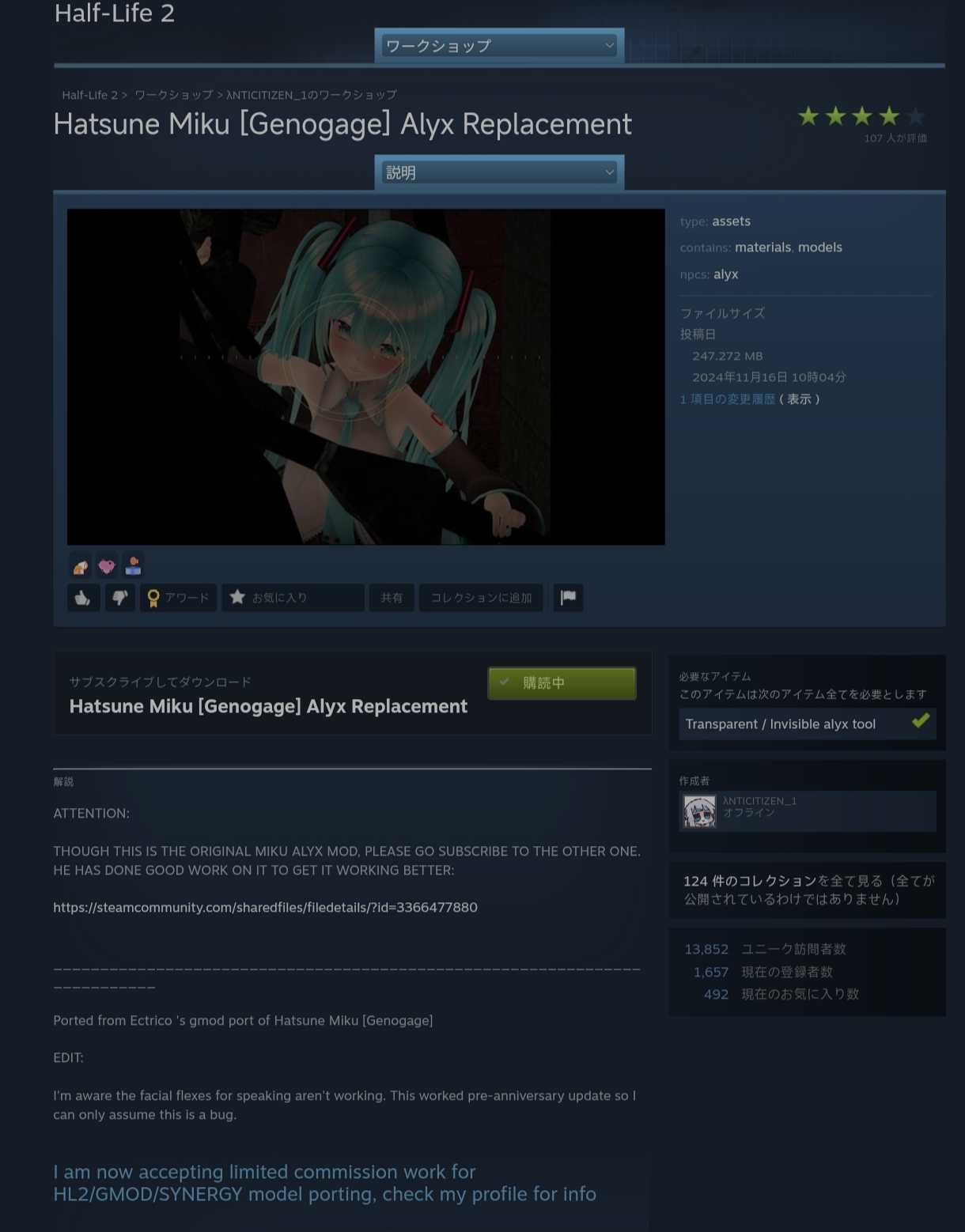 半条命2 初音ミク替换alyx相关信息