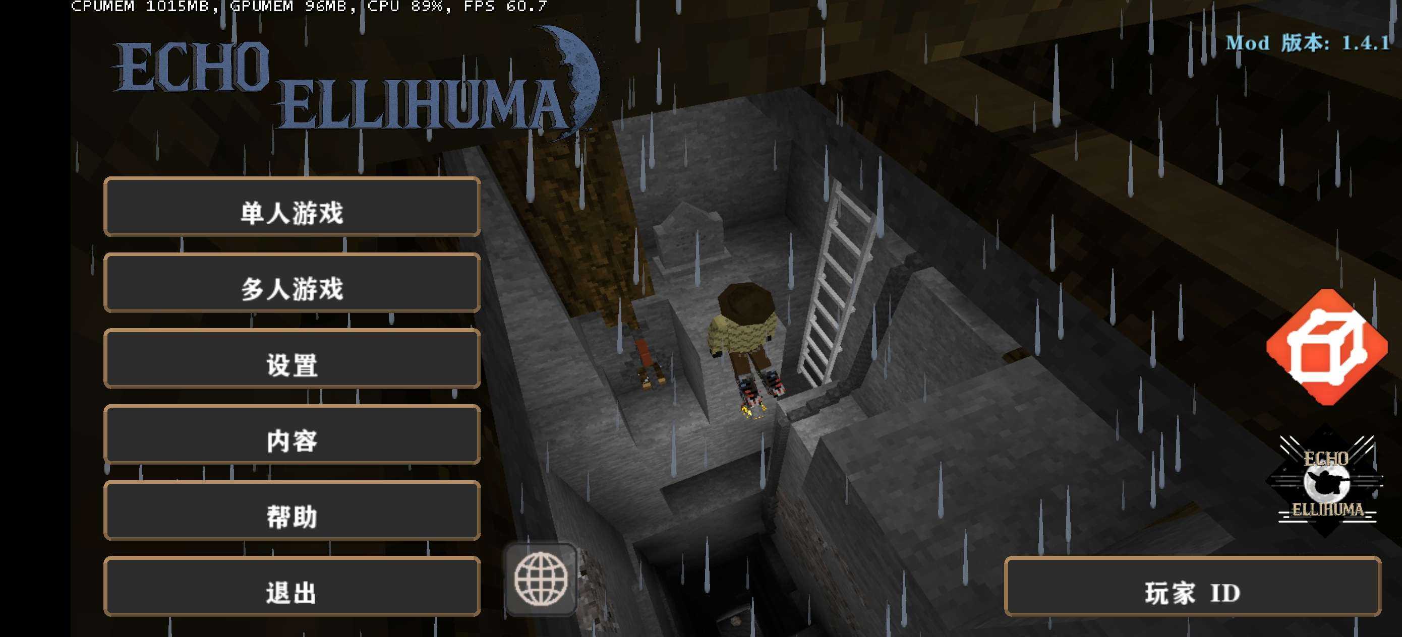 由俄国作者所开发的微仿现实类生存战争模组(或同人)—— Echo Ellihuma 作者现已推出Android手机版 此为转载 1.4.1更新如下: BUG修复: 1. 修复了从主菜单导致游戏崩溃的错误。 2. 修复了Embrace模式——现在玩家的重生位置正确,天空始终为夜晚。 3. 修正了“诀窍”信息中安卓版本开发者的说明。 4. 现在切换语言会再次把玩家带回主菜单。 5. 调整了鱼竿的功能——钓鱼变得更简单(小游戏现在只需要轻点一次);当生物在渔夫上方时,鱼竿不再能把它们抛到空中;鱼竿不再允许玩家驾驶自己坐着的船在空中飞行;失去鱼竿时,现在会正确地把浮漂从生物身上分离。 6. 修复了方块挖掘进度贴图缺失的问题。 7. 修复了游戏过程中界面闪烁的问题。 8. 现在藤蔓不再只是在深秋停止生长,而是会在秋季、深秋、初冬、冬季和晚冬完全停止生长。 9. 现在被封禁的玩家不再显示在左上角的玩家列表中。 10. 修复了会复制脂肪方块的bug。 11. 修复了安卓上的严重bug,该bug会导致玩家无法入睡。 12. 修复了玩家在首次出生时没有衣服的bug。 合成: 现在海胆不仅可以用石头打开,还可以用石锤或玄武岩锤打开。 新增: 1. 加入了一个切换建筑长按(方块连点)的按钮。 2. 在主菜单中加入了语言切换按钮。 3. 在“设置 - 界面”中新增了一个用于简化全景(启用旧原版样式)的按钮。 旧内容变更: 删除了添加本地角色的按钮。