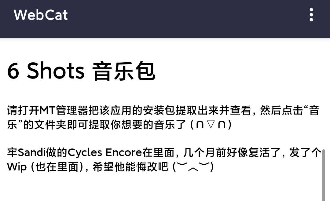 牢Sandi的Cycles Encore也在里面 下载安装后用 MT管理器 提取安装包后查看,音乐就在“音乐”文件夹里(∩▽∩) 已补充音乐封面、专辑、作者( ̄▽ ̄)~*