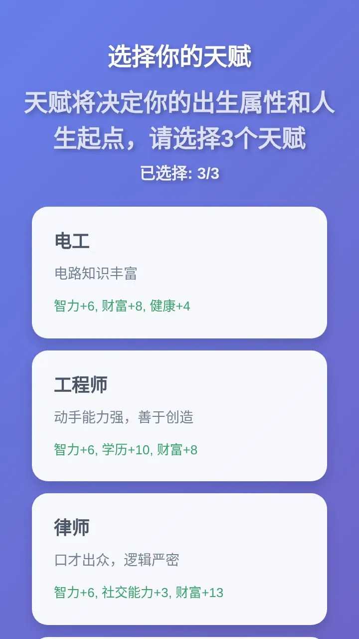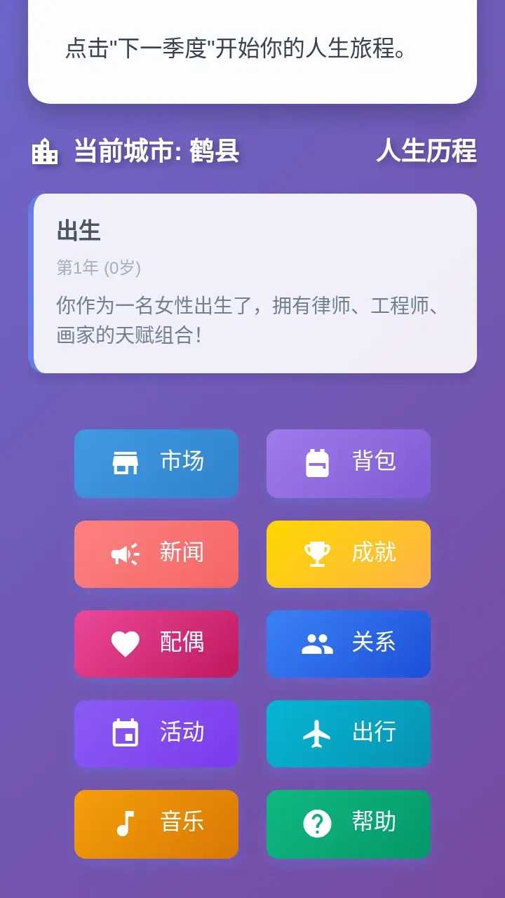 在这款人生模拟器中,你将从出生那一刻开启专属人生旅程!自由选择电工、工程师、律师等特色天赋组合,每一个选择都将塑造你的属性面板——智力、财富、社交能力等维度随成长动态变化。从鹤县的童年起步,你会经历疾病、家庭互动等随机人生事件,也能通过市场、出行、创业等玩法自主掌控人生方向,解锁成就、经营关系、探索不同城市,最终打造独属于你的人生故事!